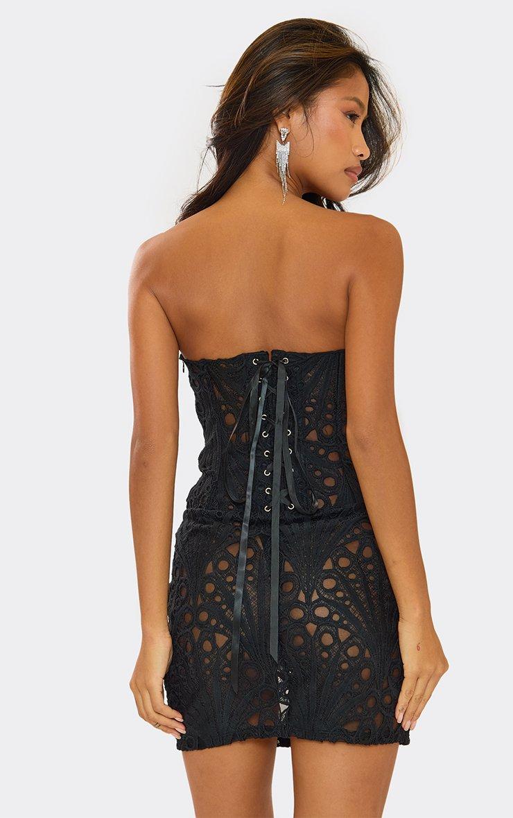 Bandeau Corset Detail Mini Dress In Black Textured Lace