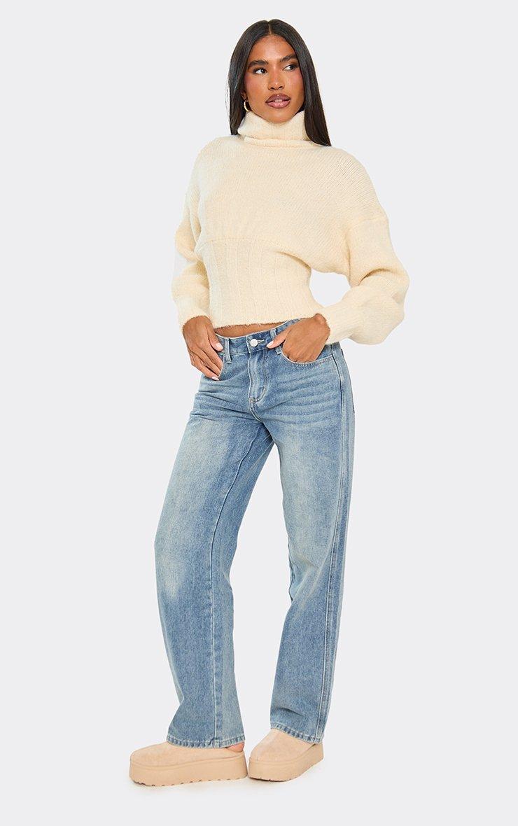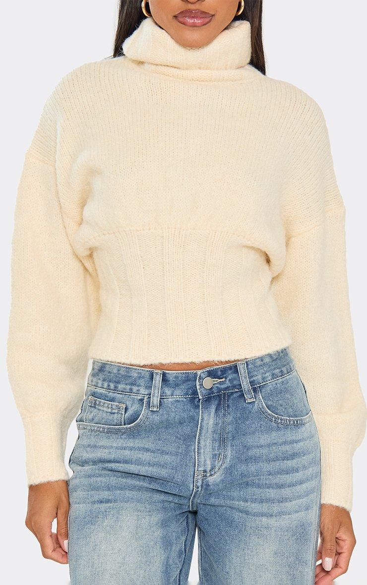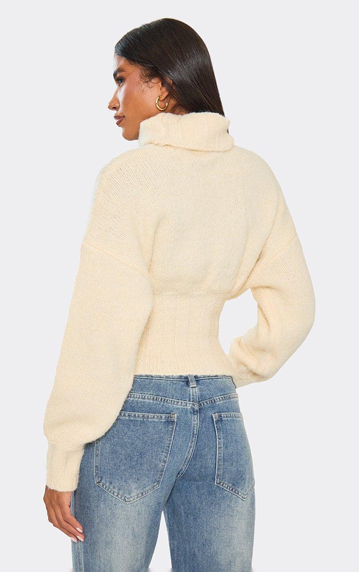Roll Neck Cinched Waist Jumper In Cream Knit