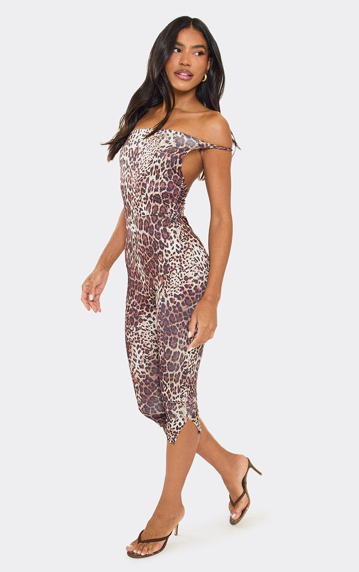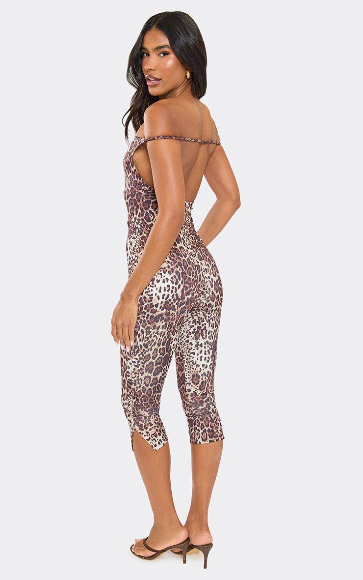 Off The Shoulder Capri Jumpsuit In Brown Leopard Print