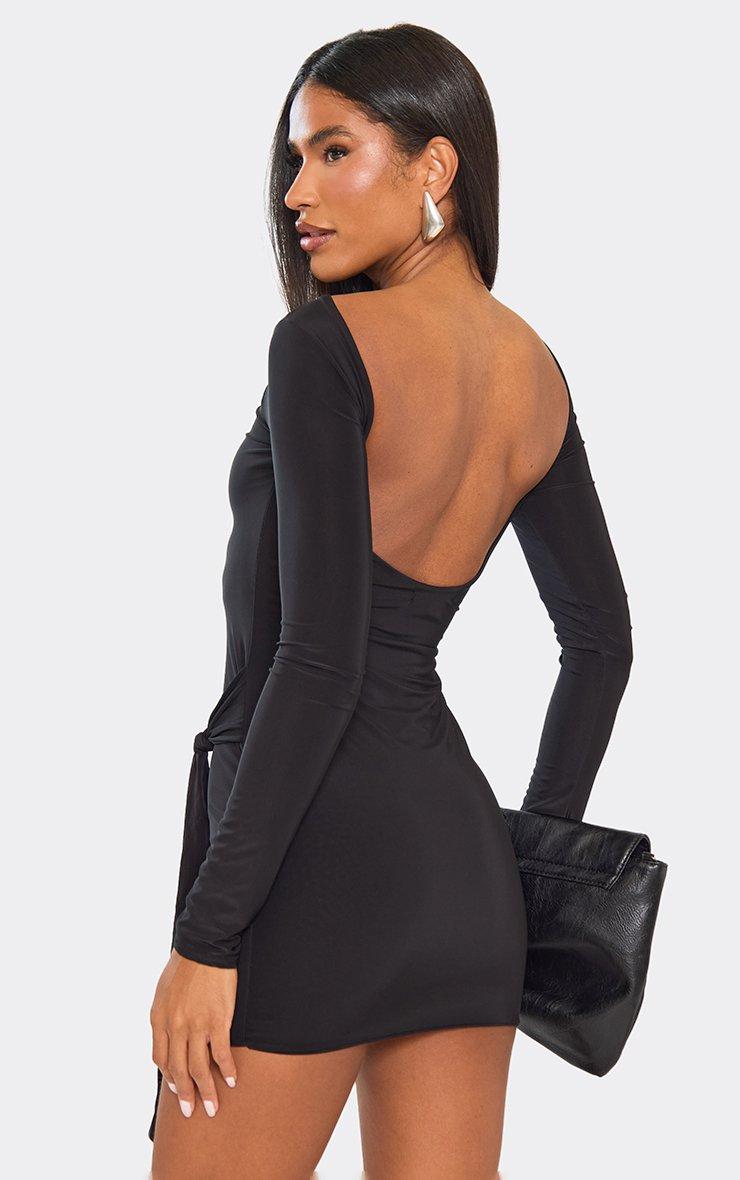 Long Sleeve Drape Trim Detail Mini Dress In Black