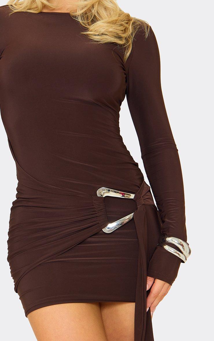 Long Sleeve Drape Trim Detail Mini Dress In Chocolate Brown