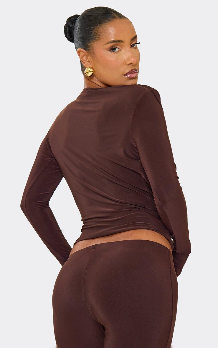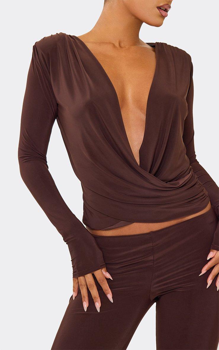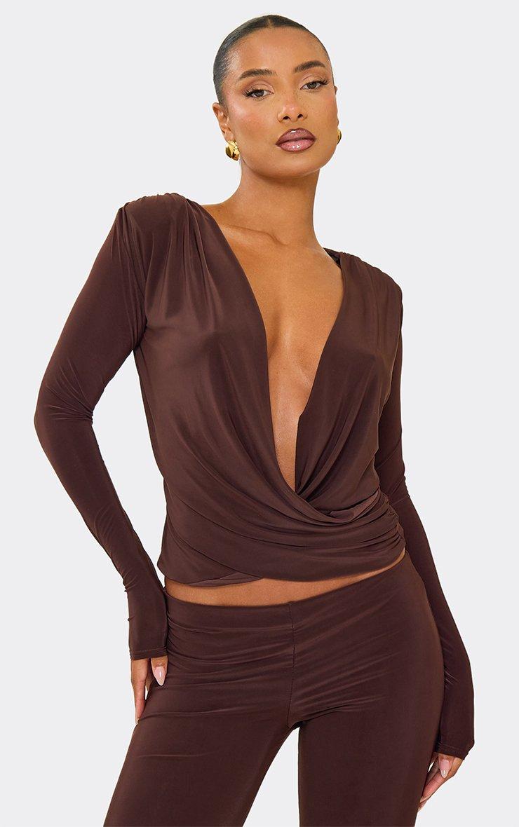 Long Sleeve Cowl Neck Wrap Top In Chocolate Brown Slinky