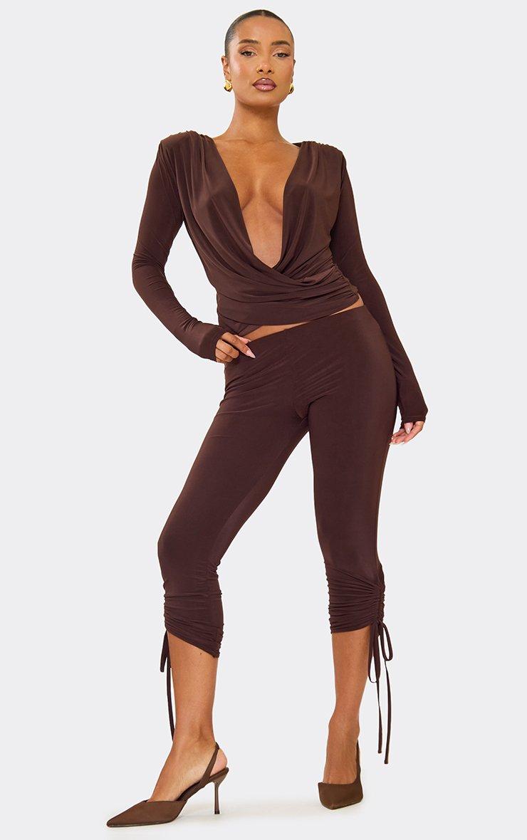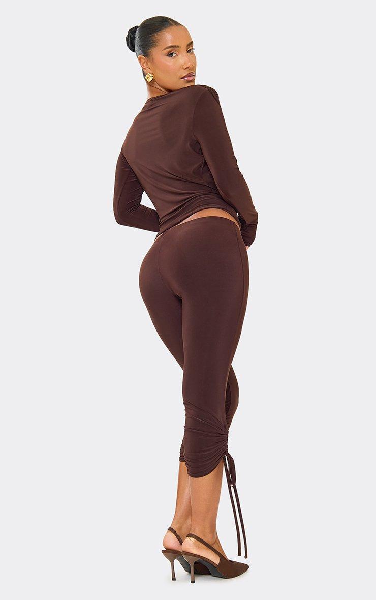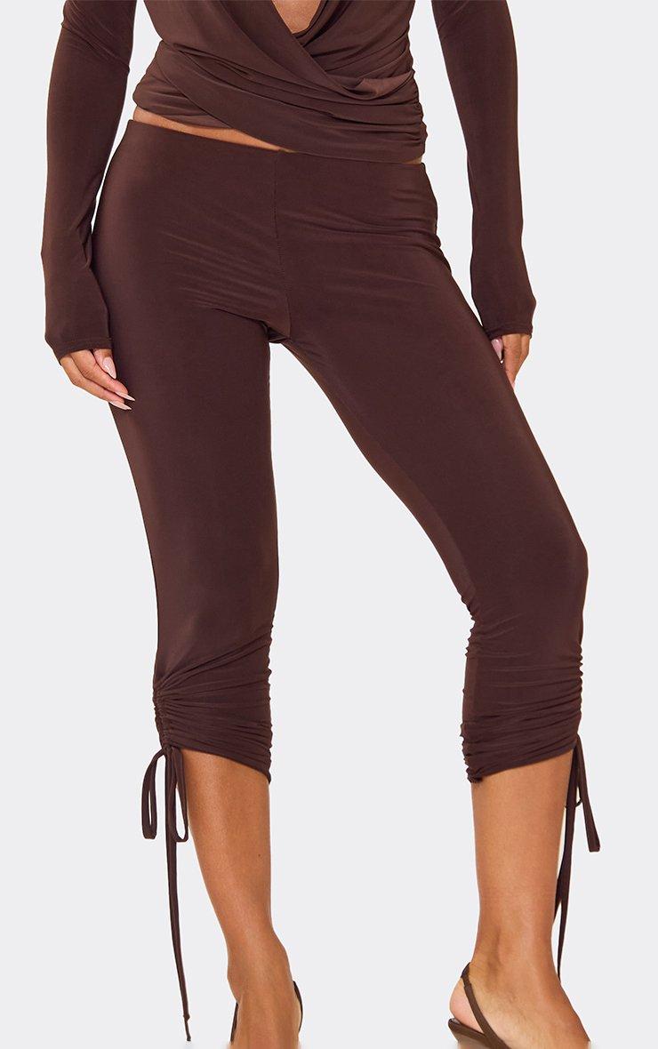 Ruched Tie Detail Capri Legging In Chocolate Brown Slinky