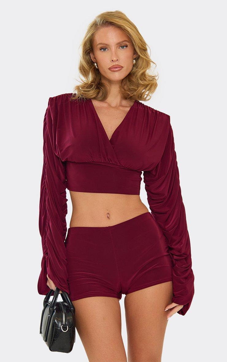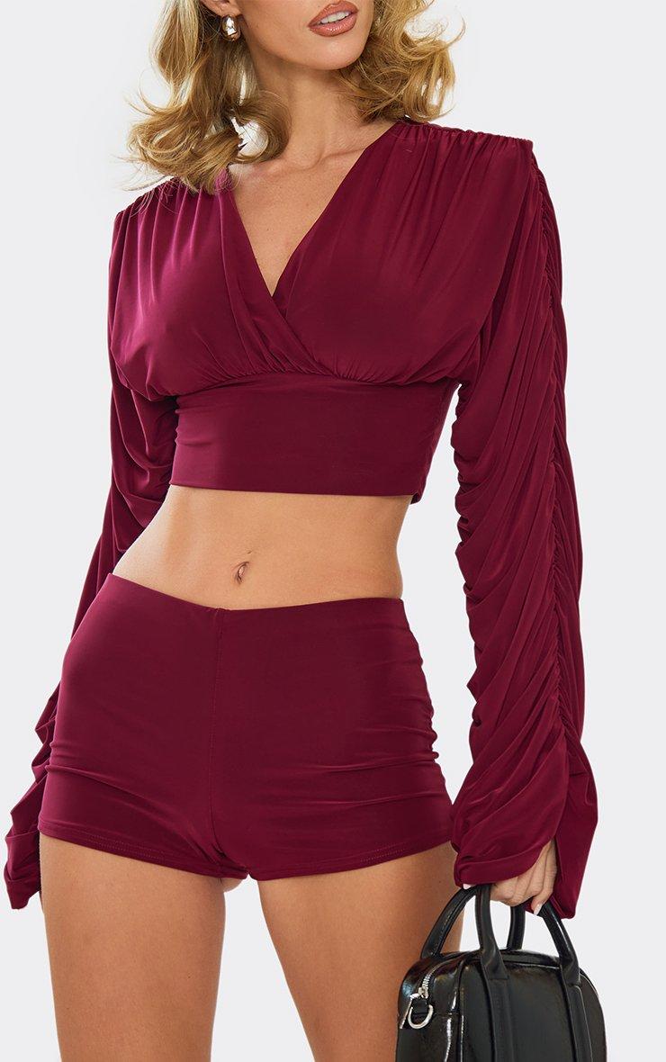 Long Ruched Sleeve V Neck Crop Top In Burgundy Slinky
