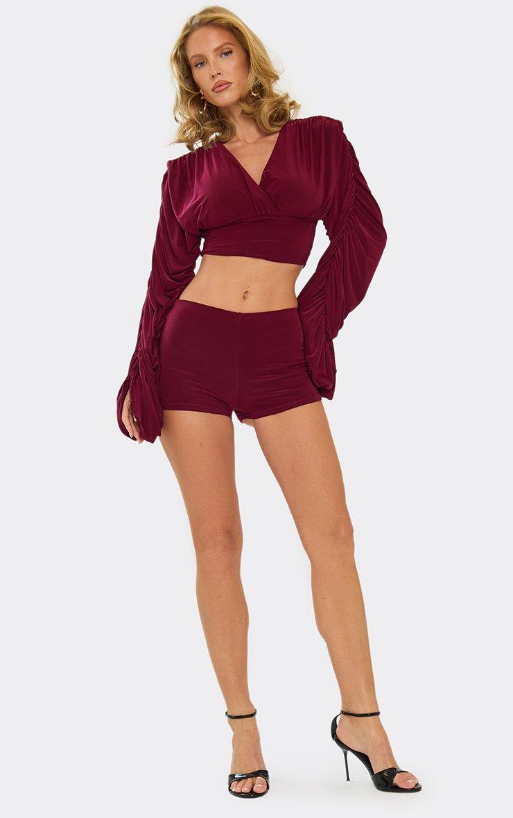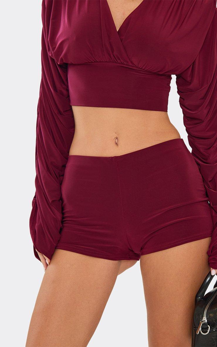 Low Rise Ruched Hot Pants In Burgundy Slinky