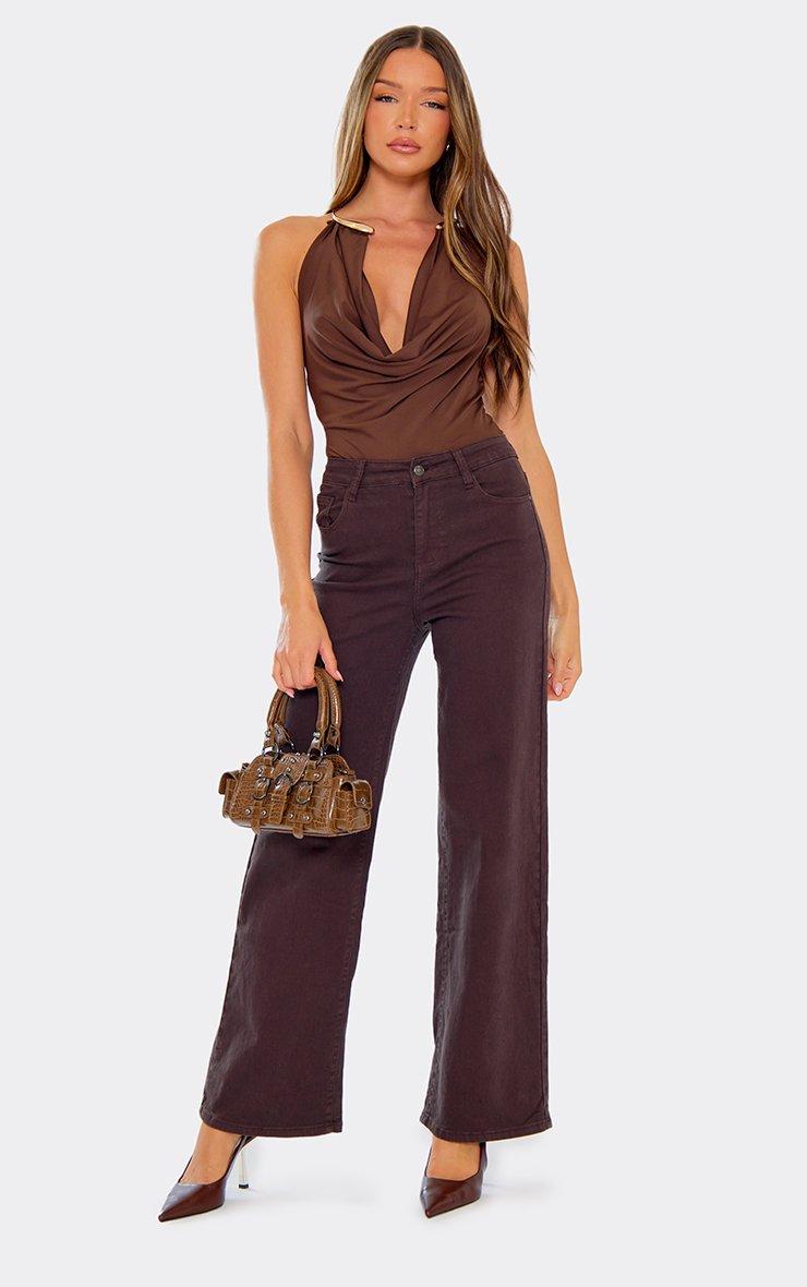 Gold Trim Detail Cowl Neck Bodysuit In Chocolate Brown