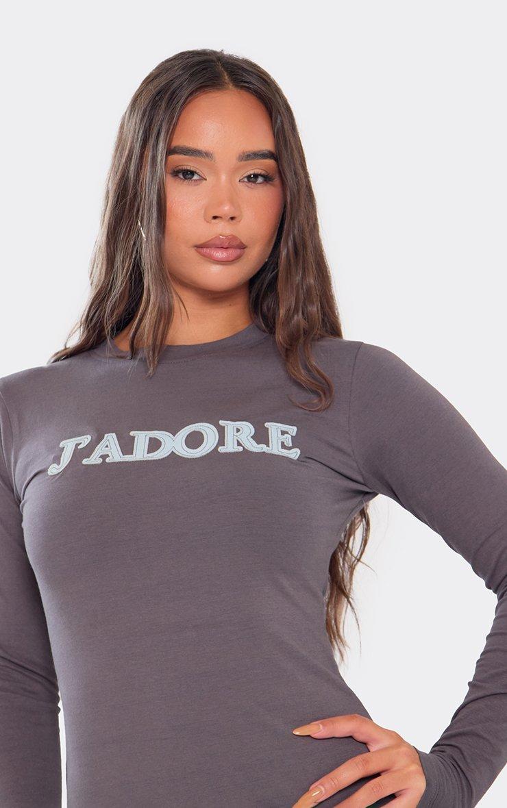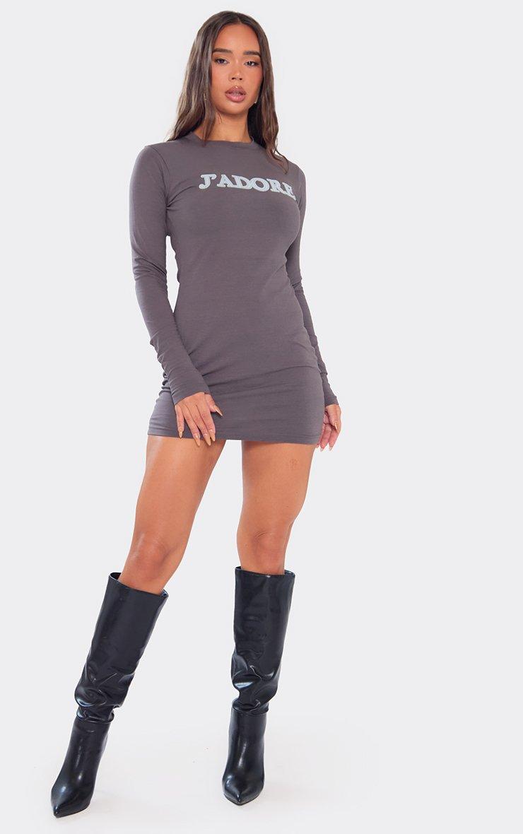 Long Sleeve Distressed J'Adore Logo Mini Dress In Grey