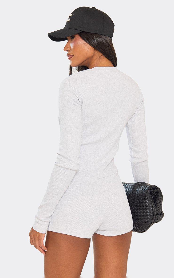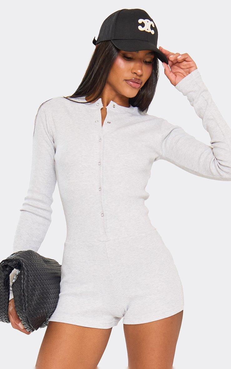 Long Sleeve Button Front Detail Playsuit In Grey Ribbed