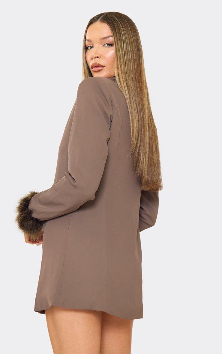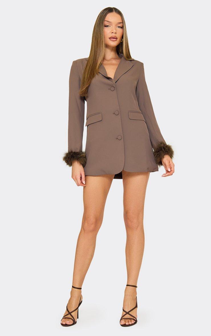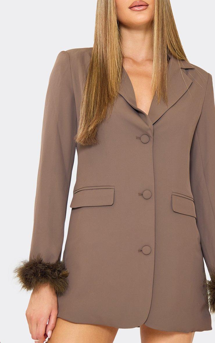 Long Sleeve Feather Cuff Detail Blazer Dress In Chocolate Brown