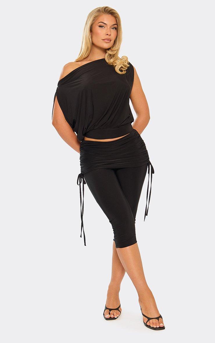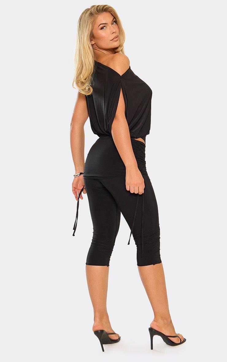 Slash Neck Off The Shoulder Cinched Waist Ruched T-Shirt In Black