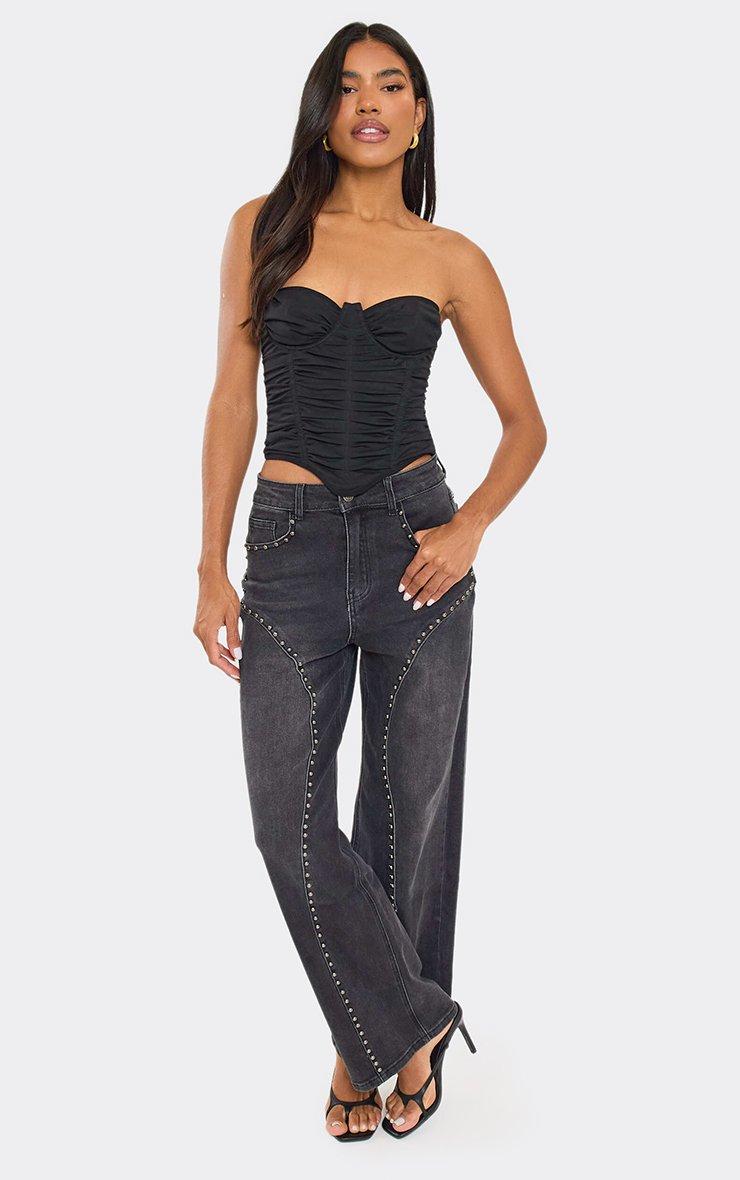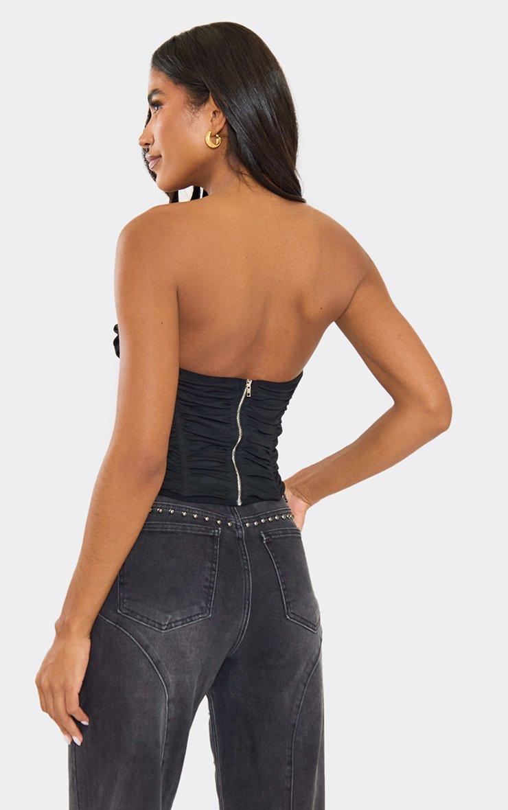 Bandeau Ruched Detail Corset Top In Black Mesh