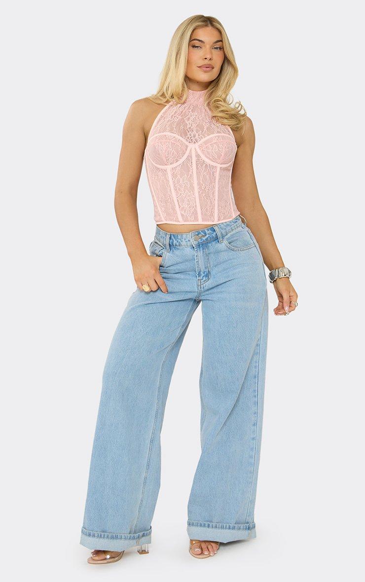 Bandeau Lace Up Back Frilled Hem Corset Top In Pink