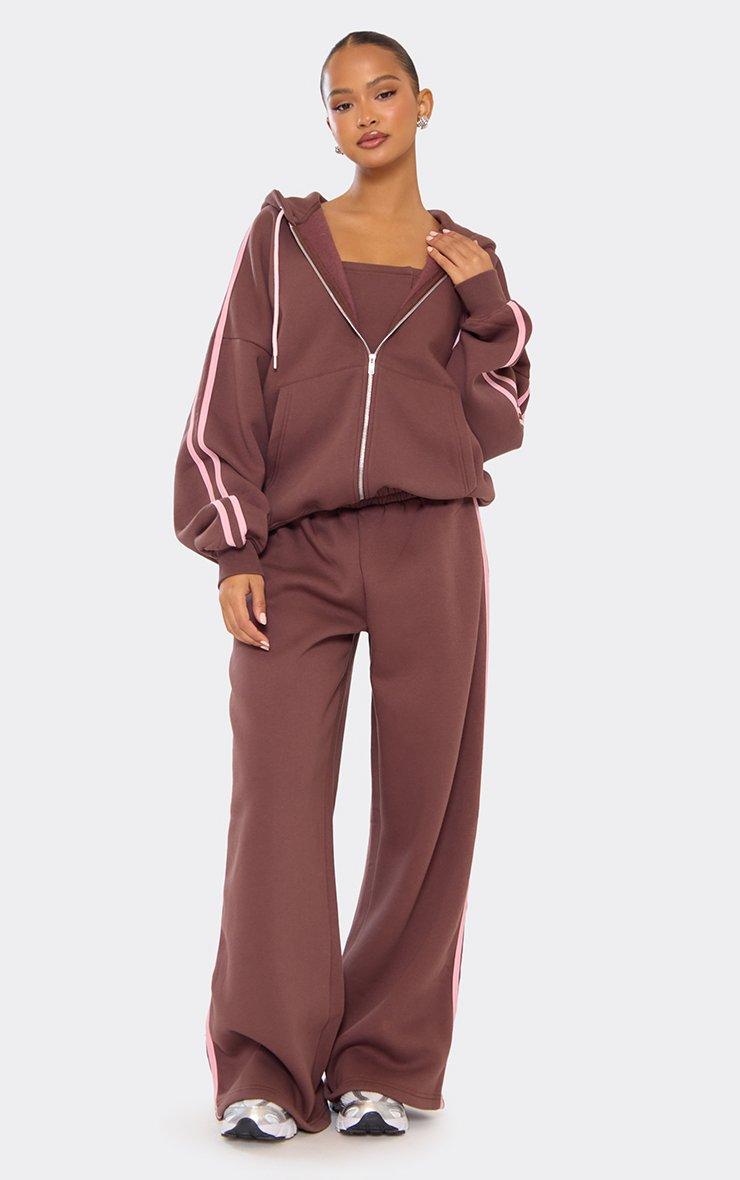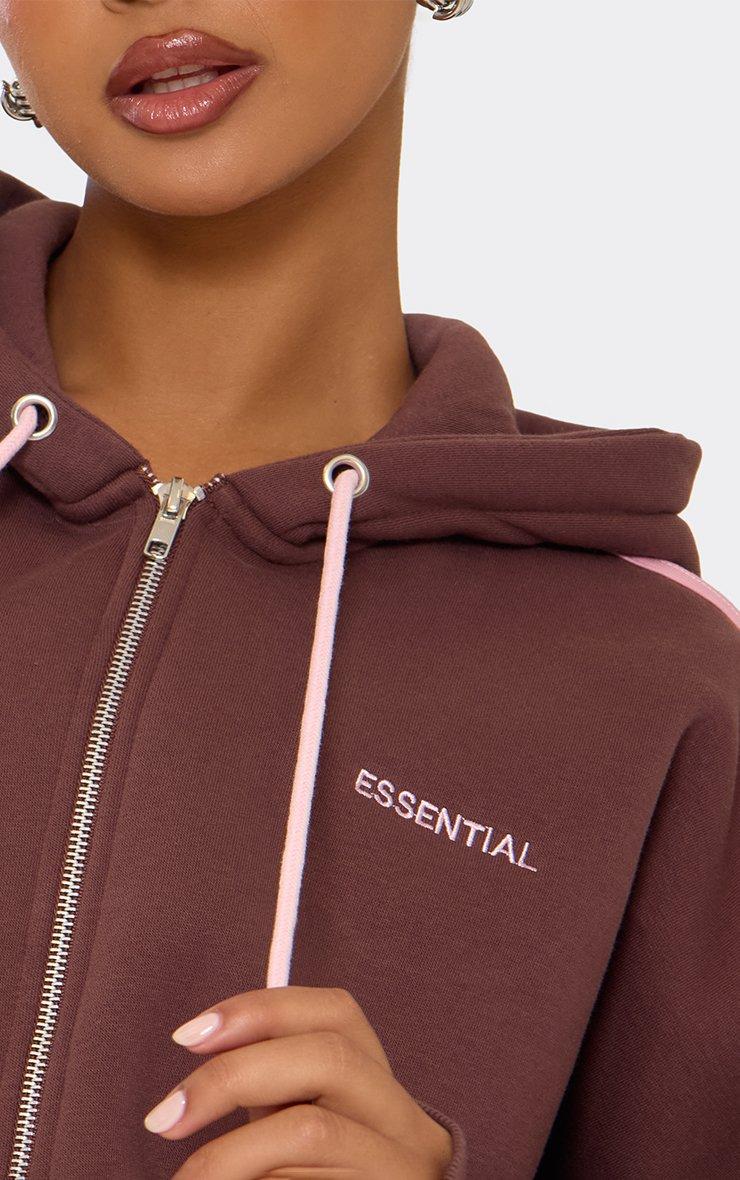 Oversized Contrast Stripe Detail Essential Graphic Zip Up Hoodie In Chocolate Brown