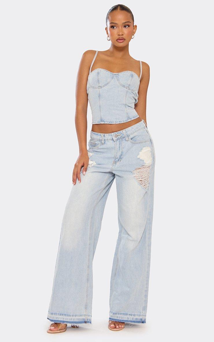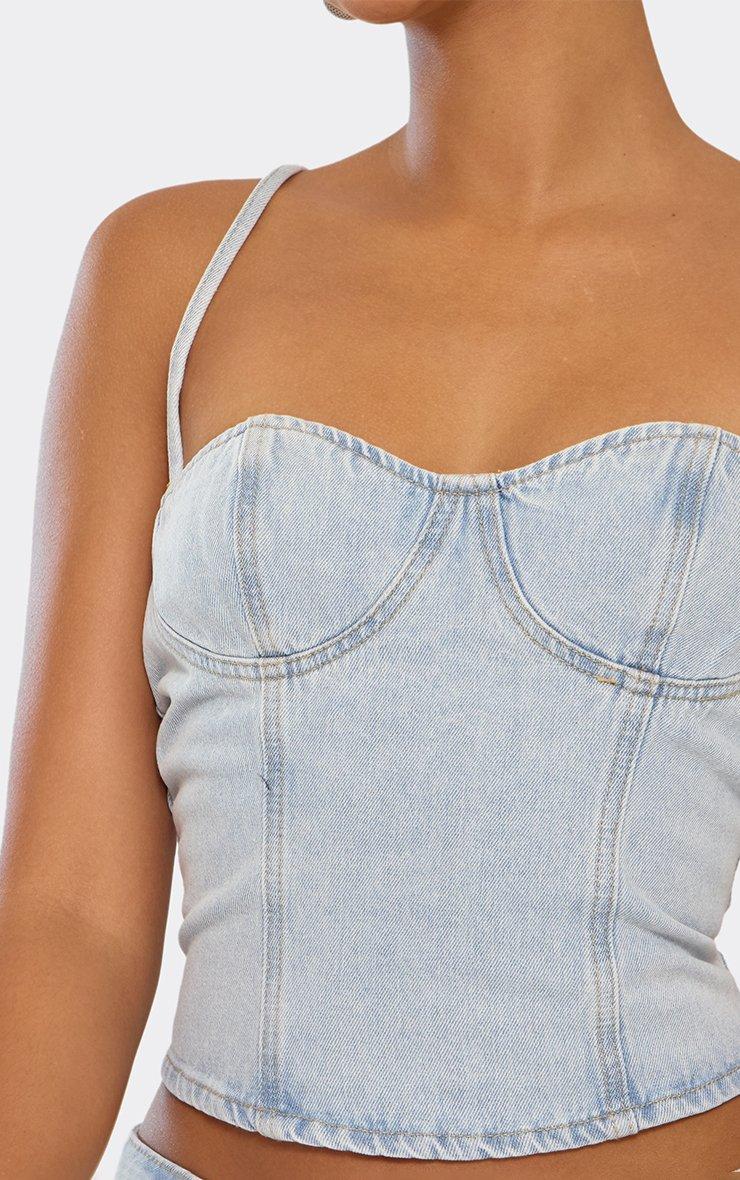 Sleeveless Lace Up Front Crop Top In Vintage Blue Denim