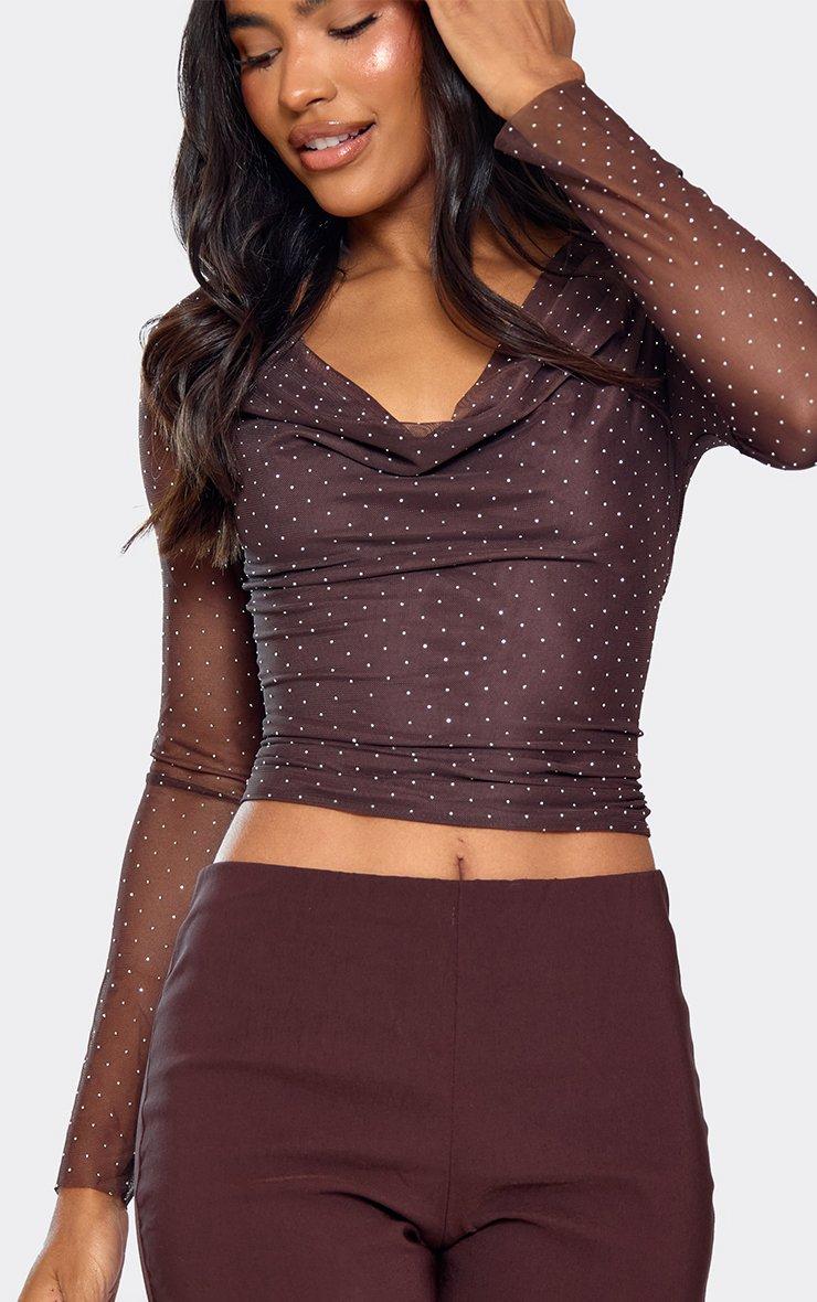 Cowl Neck Mesh Detail Top In Brown Polka Dot
