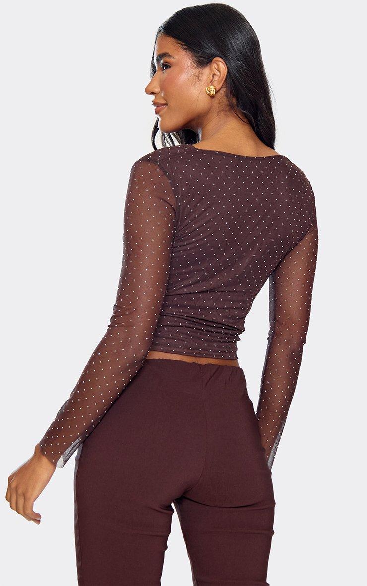 Long Sleeve Contrast Detail Curved Hem Football Top In Chocolate Brown
