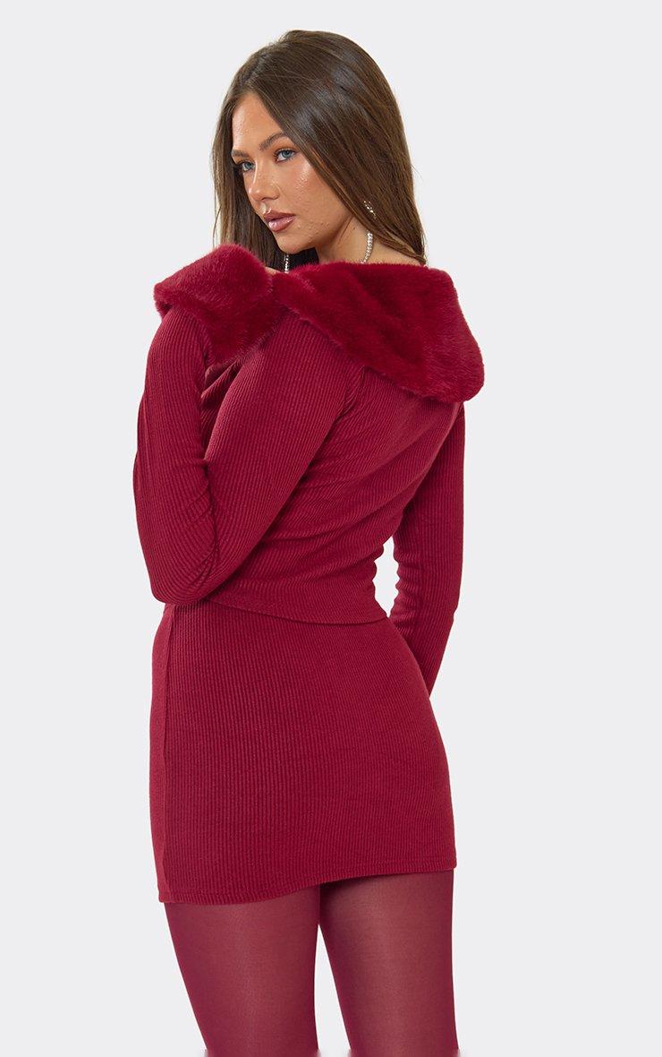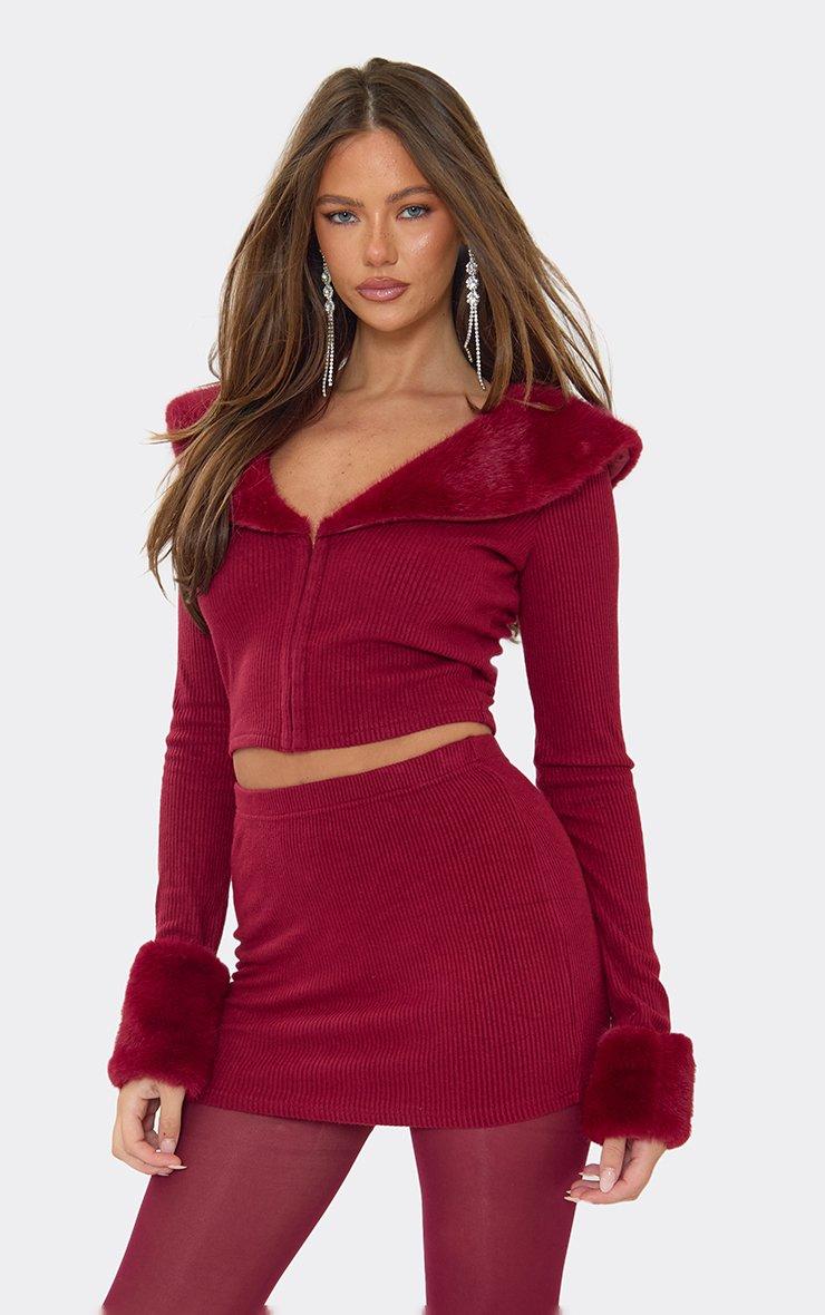 Long Sleeve Faux Fur Collared Top In Burgundy Ribbed