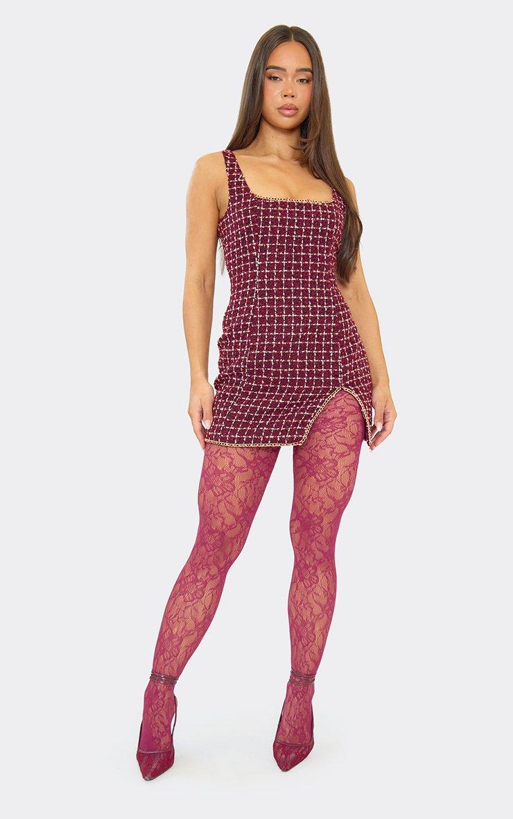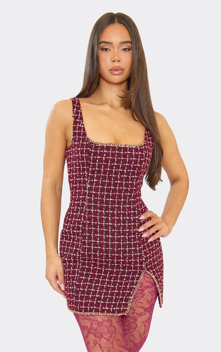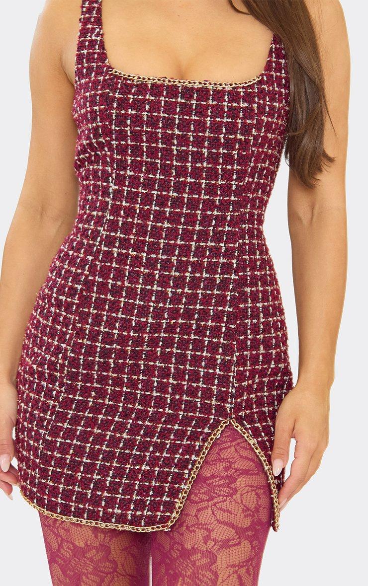 Square Neck Split Hem Mini Dress In Burgundy Checked Tweed