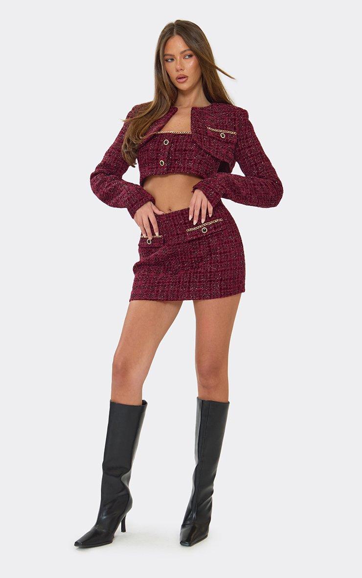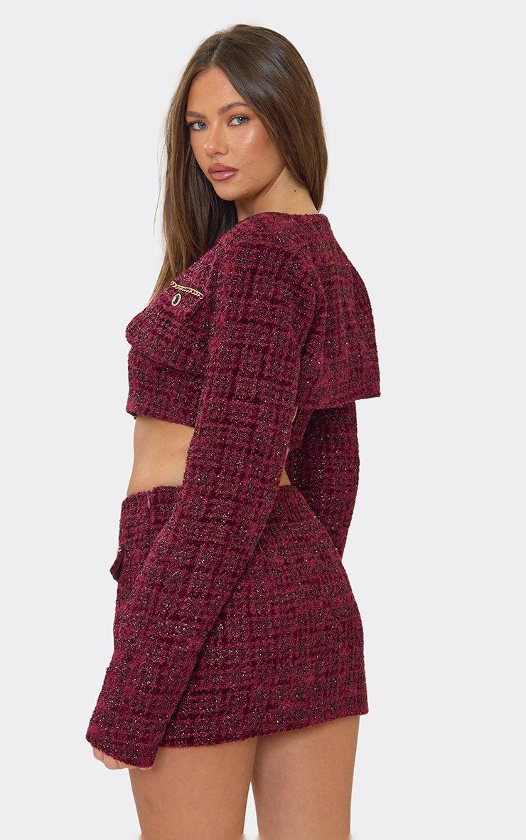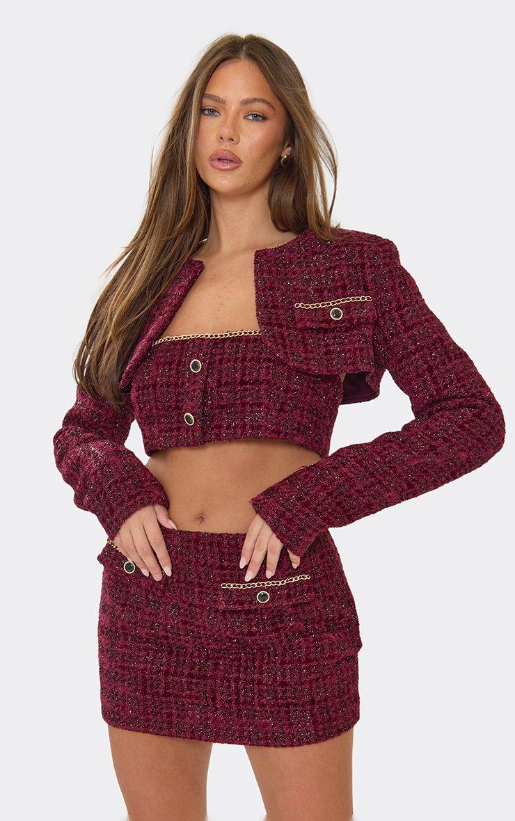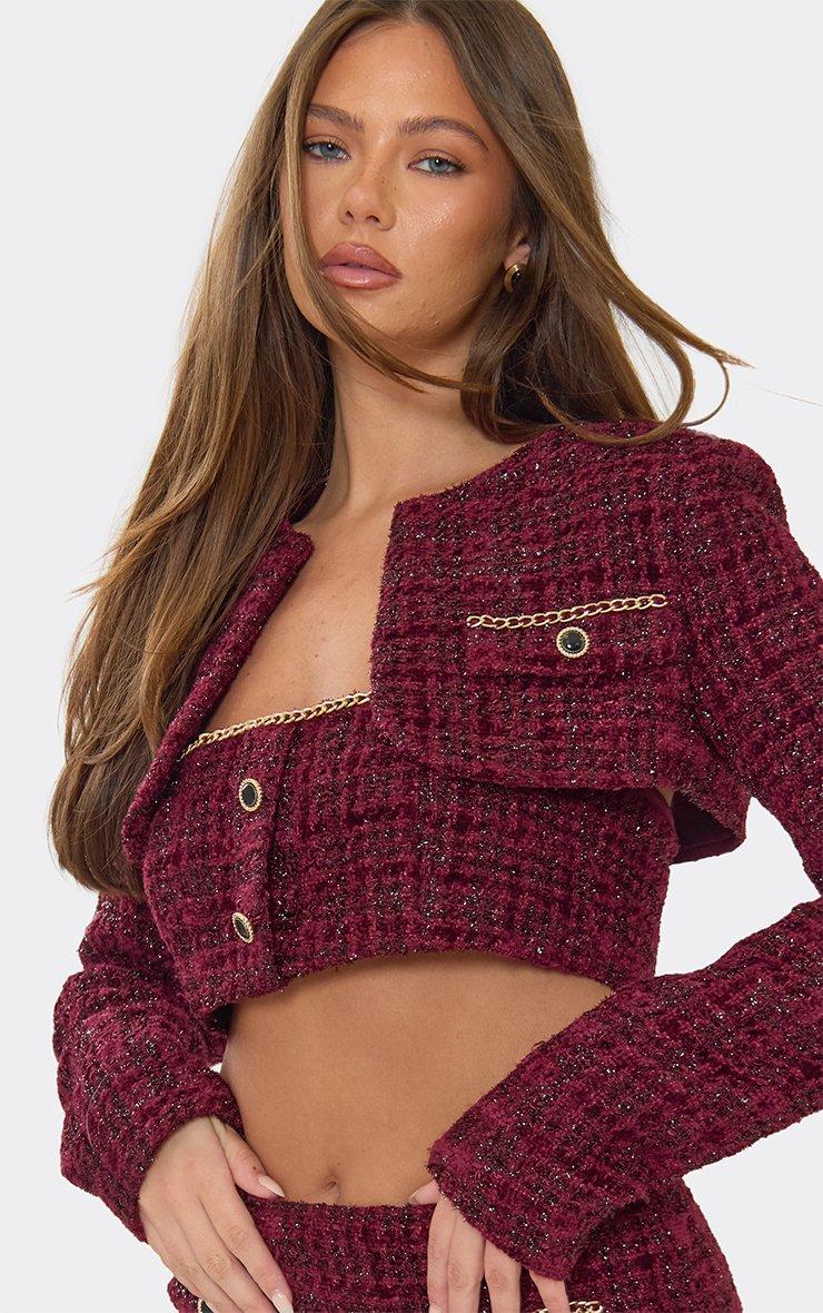 Long Sleeve Chain Trim Cropped Blazer In Burgundy Tweed
