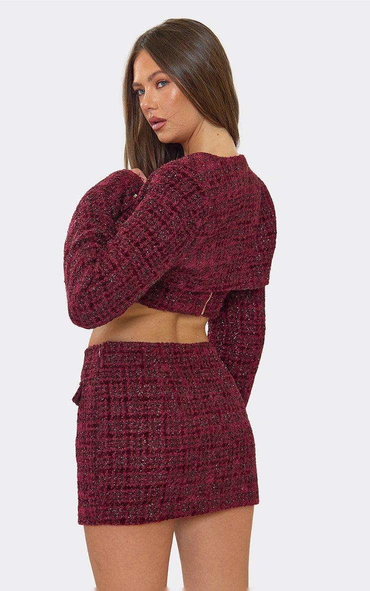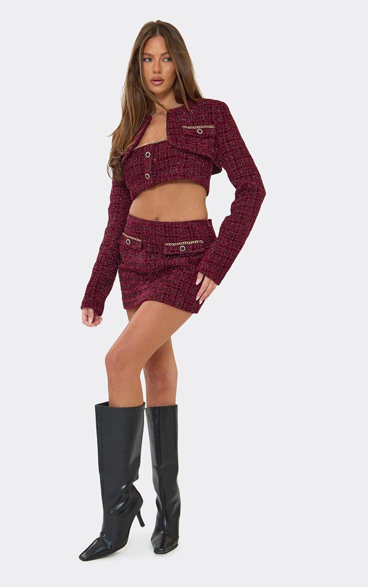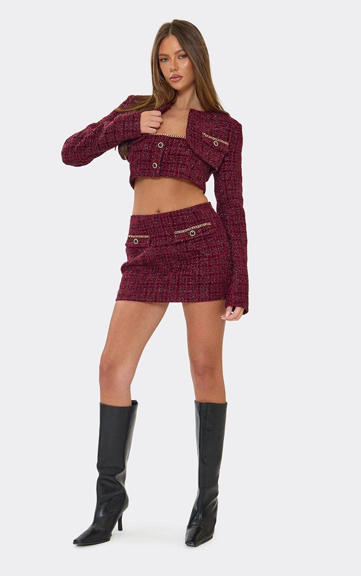 Mid Rise Chain Trim Pocket Detail Mini Skirt In Burgundy Tweed