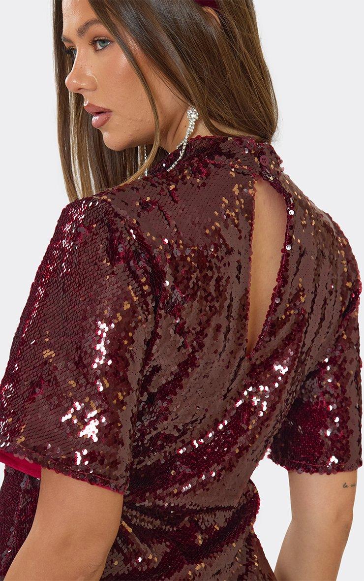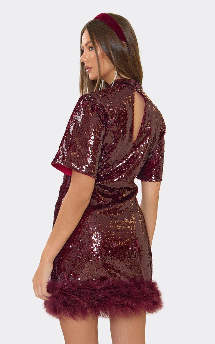 short sleeve high neck faux feather trim mini dress in burgundy sequin