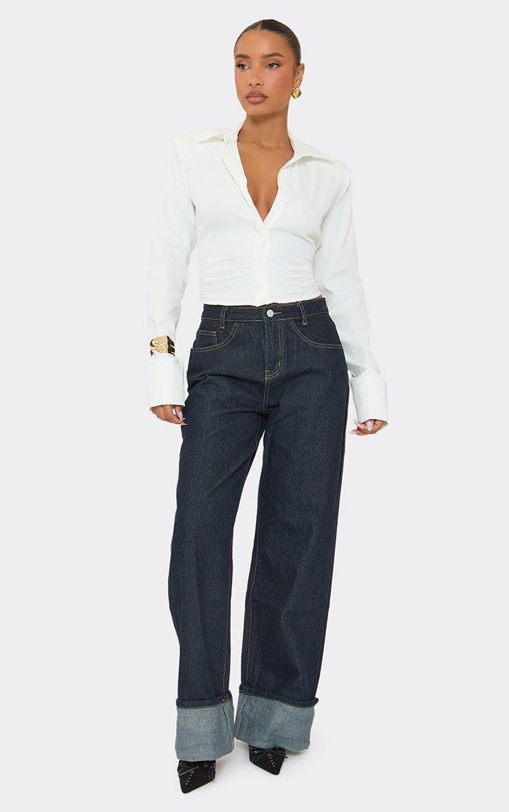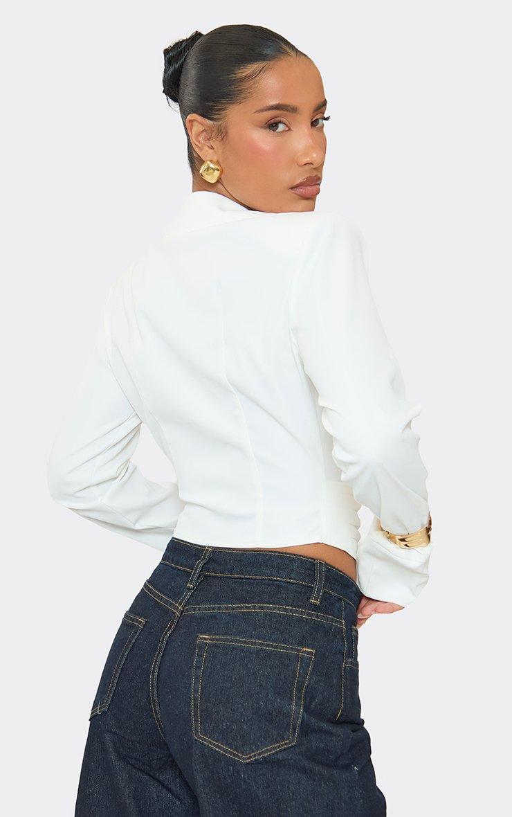 Long Sleeve Shoulder Pad Button Front Cinched Waist Shirt In White