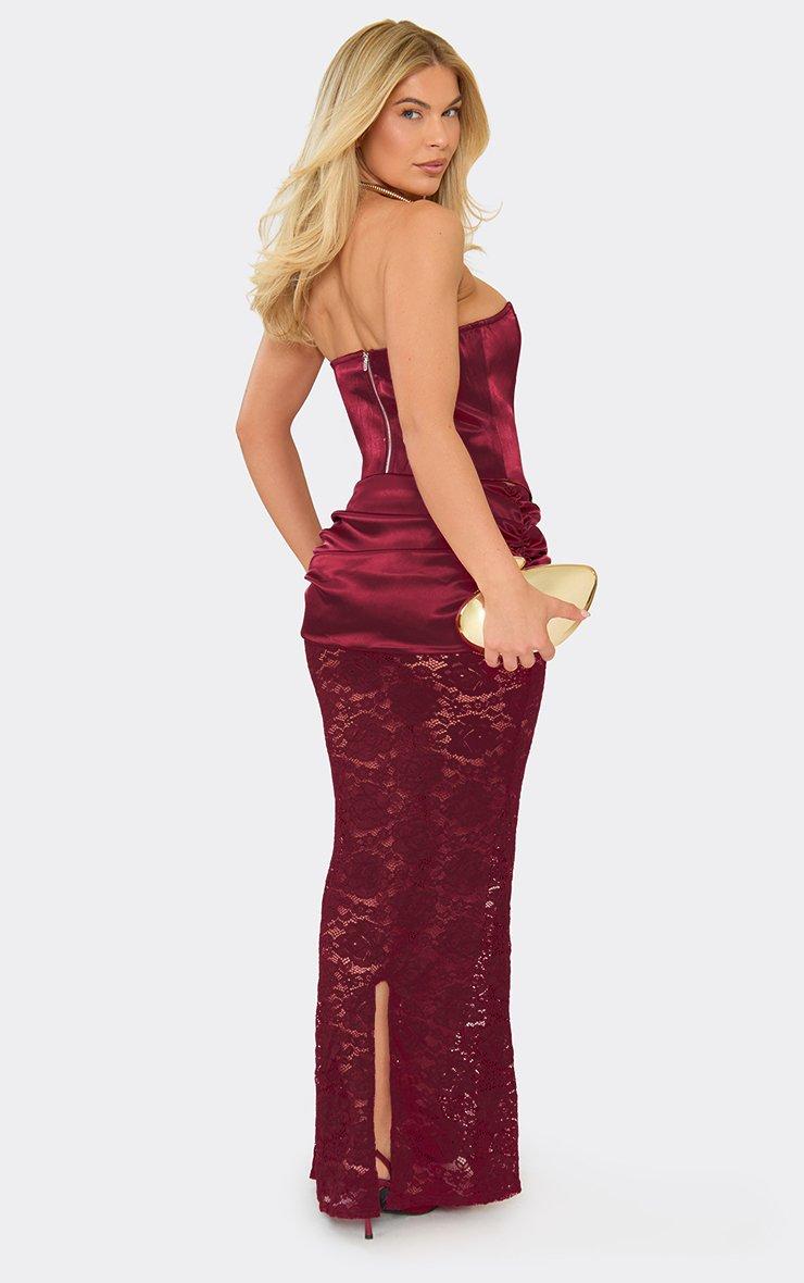 Mid Rise Contrast Lace Detail Ruched Maxi Skirt In Burgundy Satin