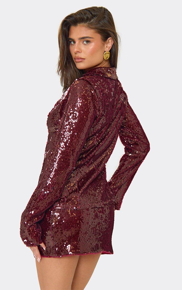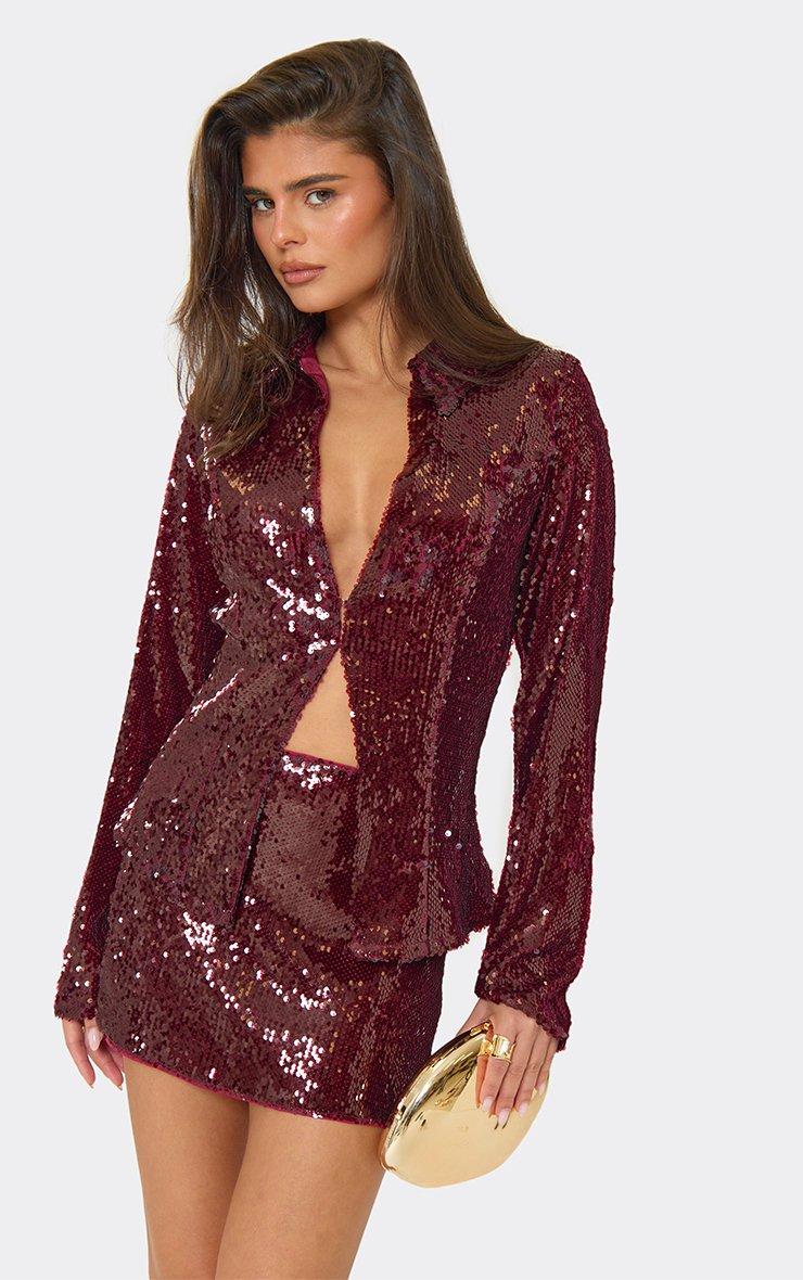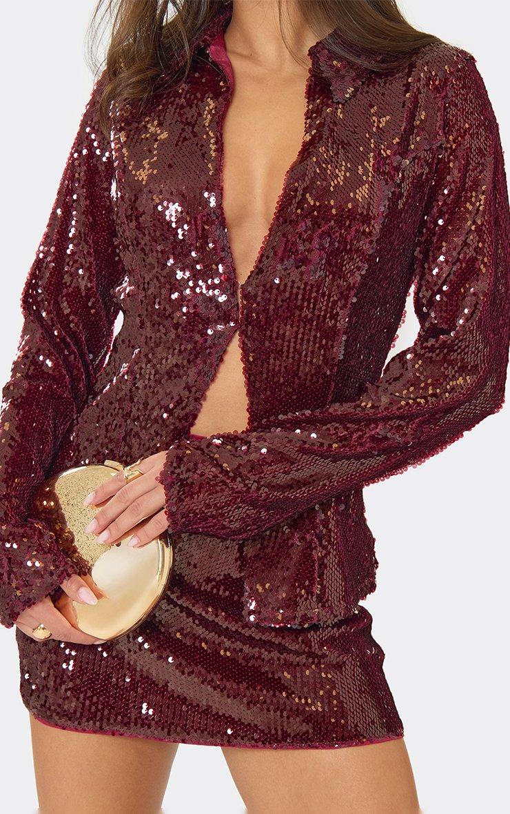 long sleeve plunge front collared detail top in burgundy sequin
