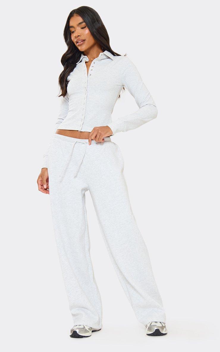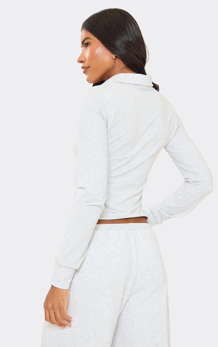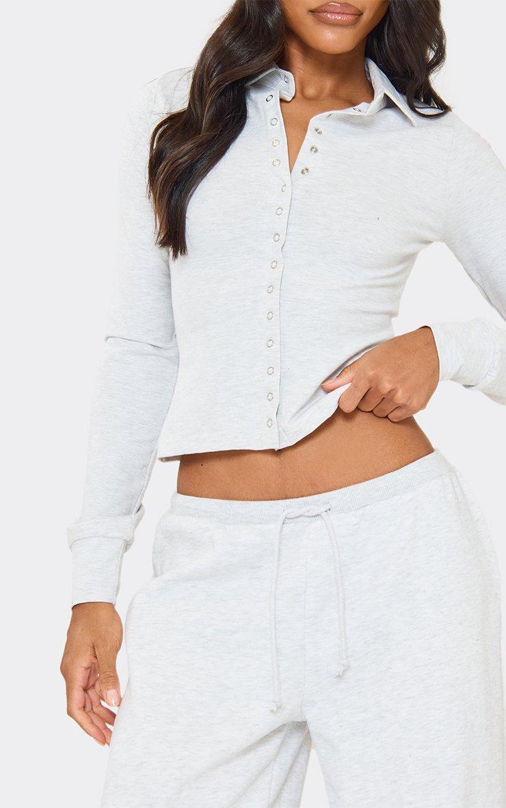 Long Sleeve Collared Popper Detail Top In Light Grey Marl