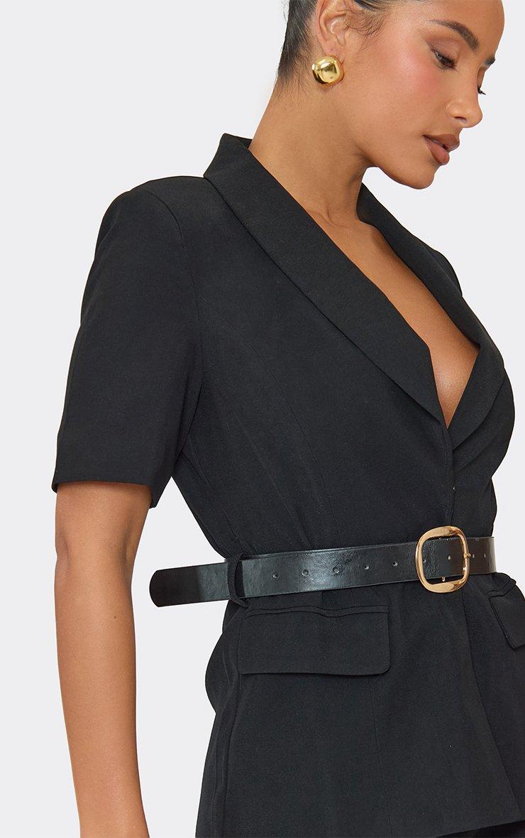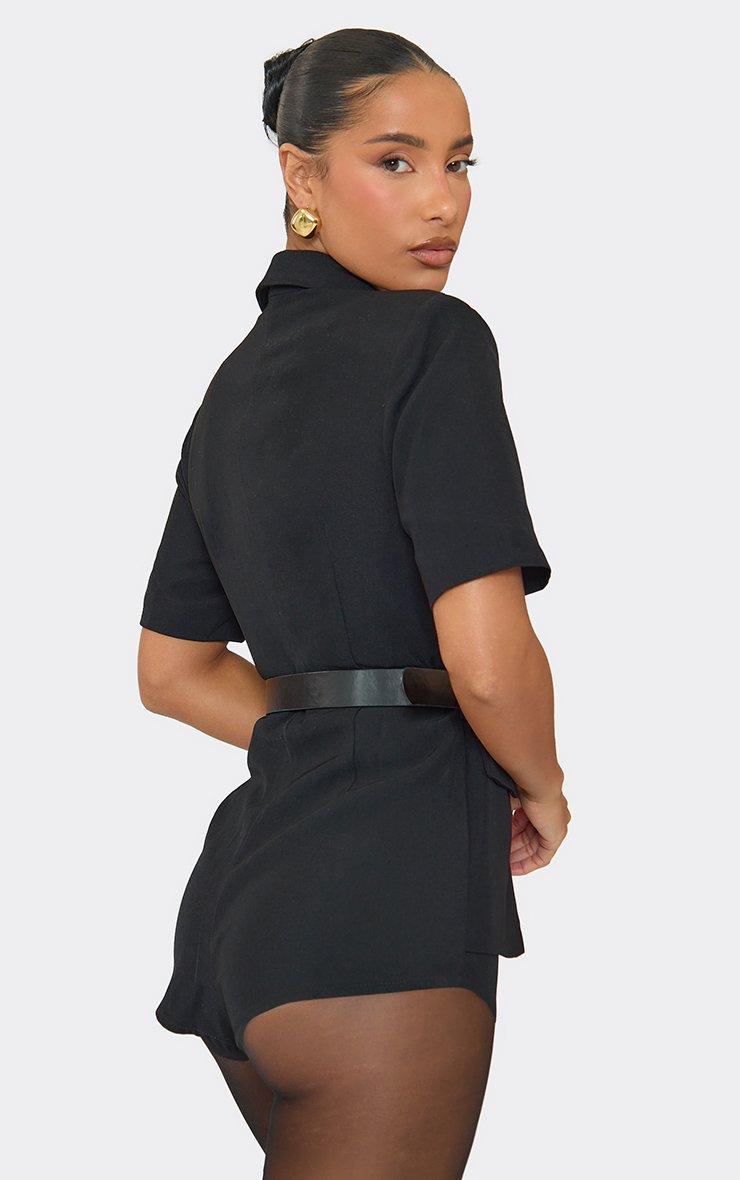 plunge neck short sleeve belted tailored playsuit in black