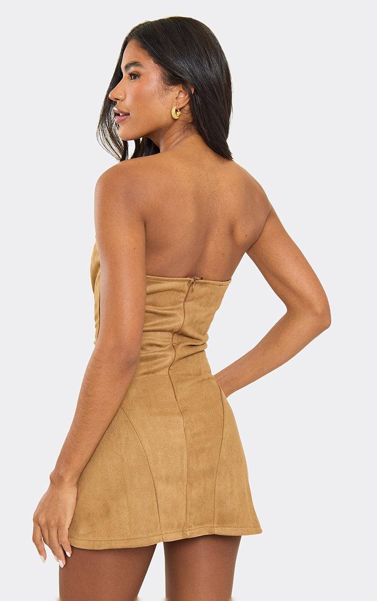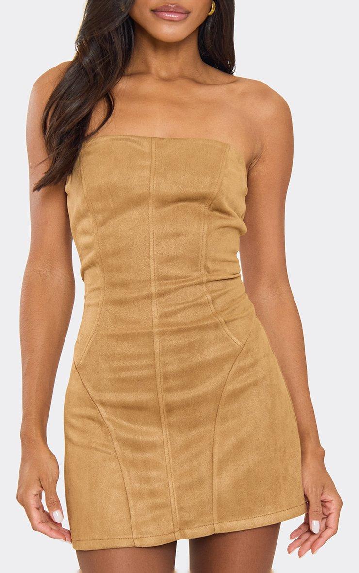 Bandeau Seam Detail Mini Dress In Tan Faux Suede