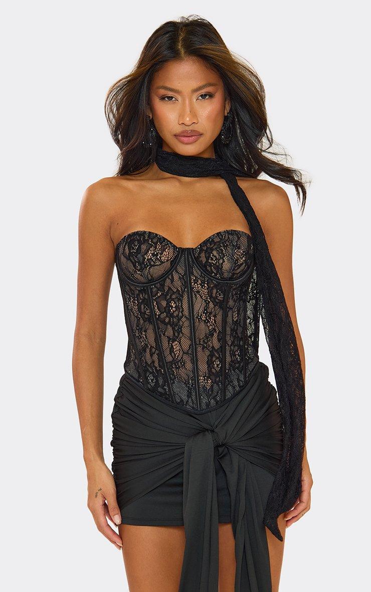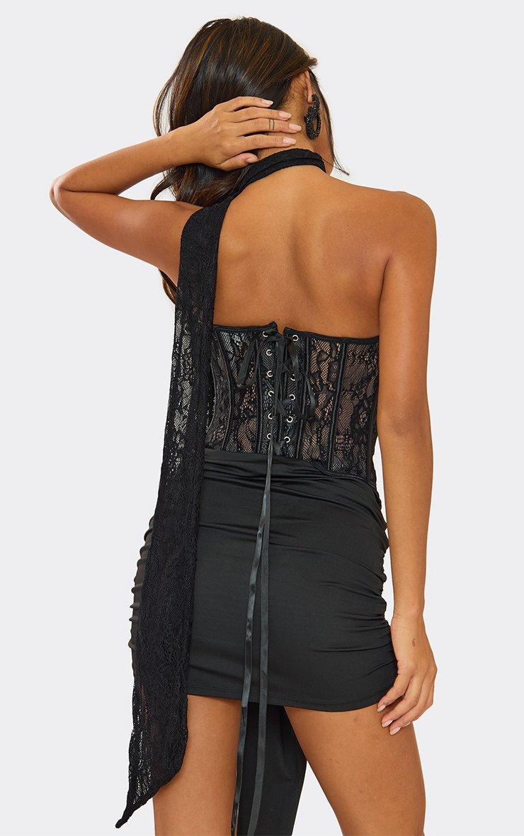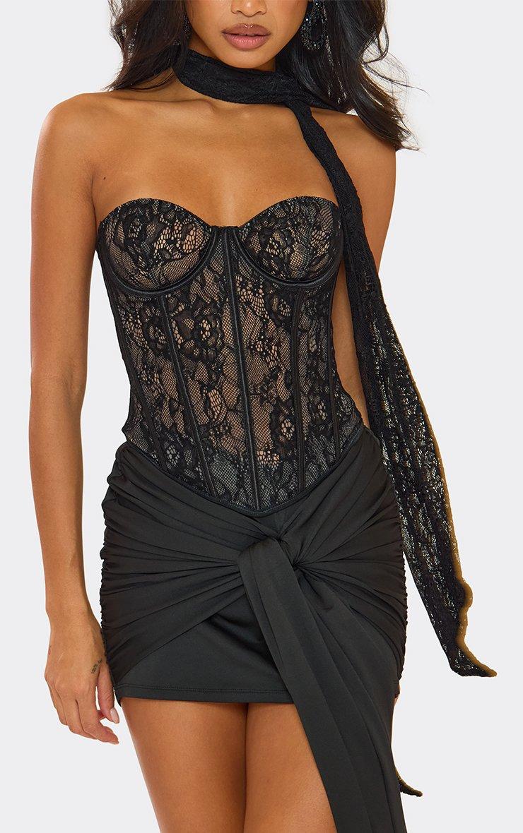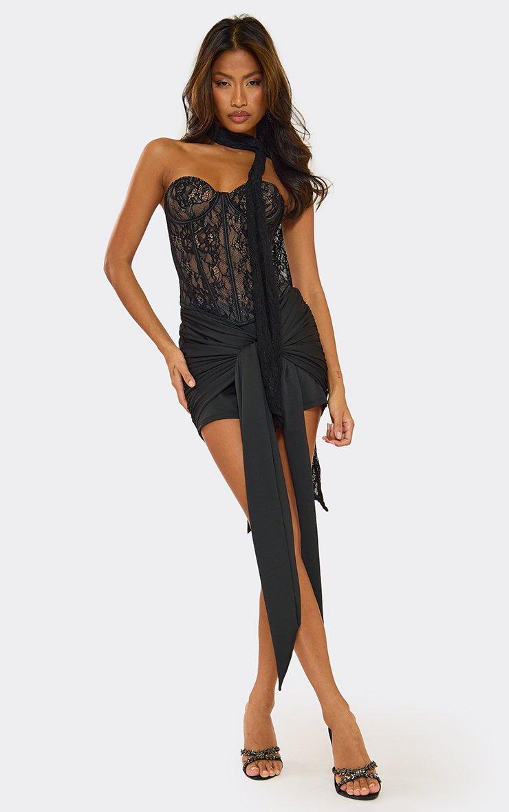 V Waist Drape Tie Front Mini Skirt In Black Satin
