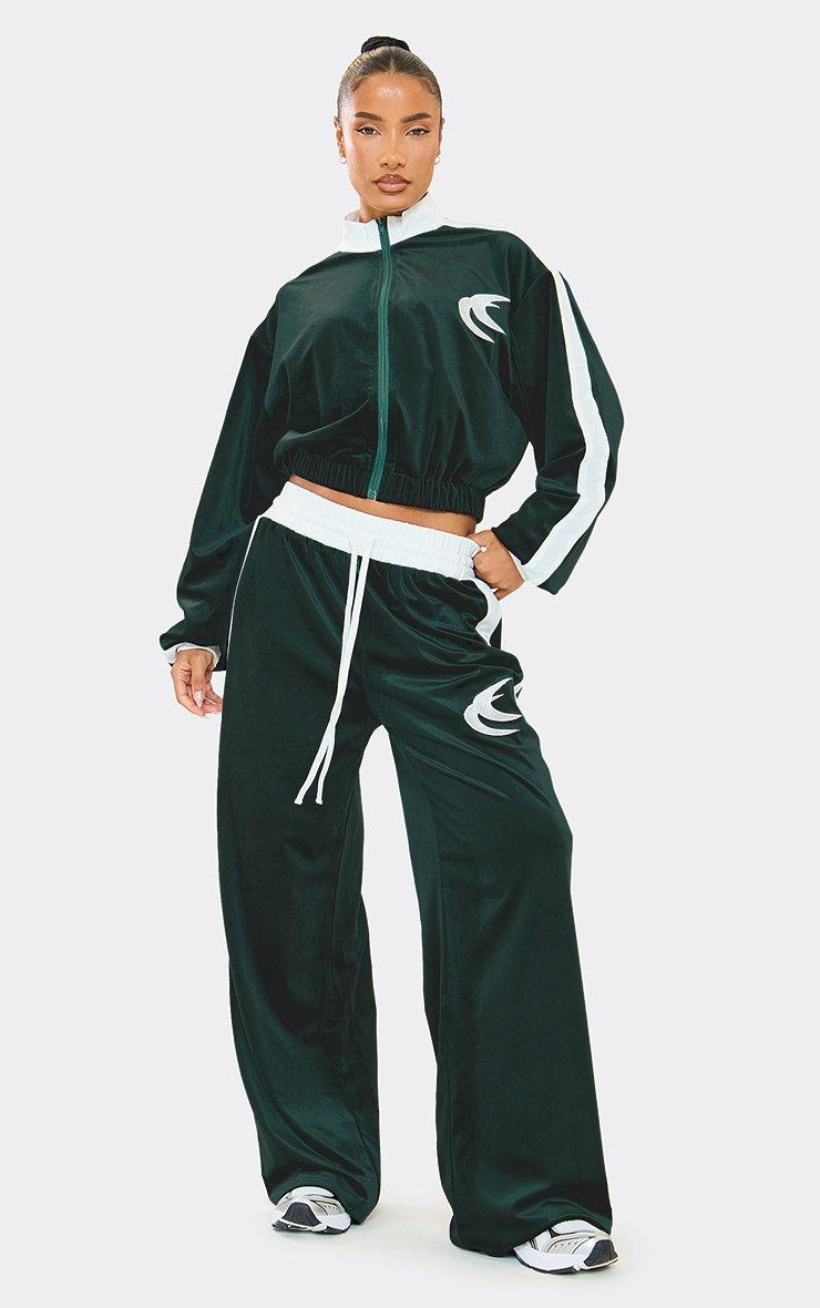 Contrast Stripe Embroidered Detail Velour Straight Leg Joggers In Green Velvet