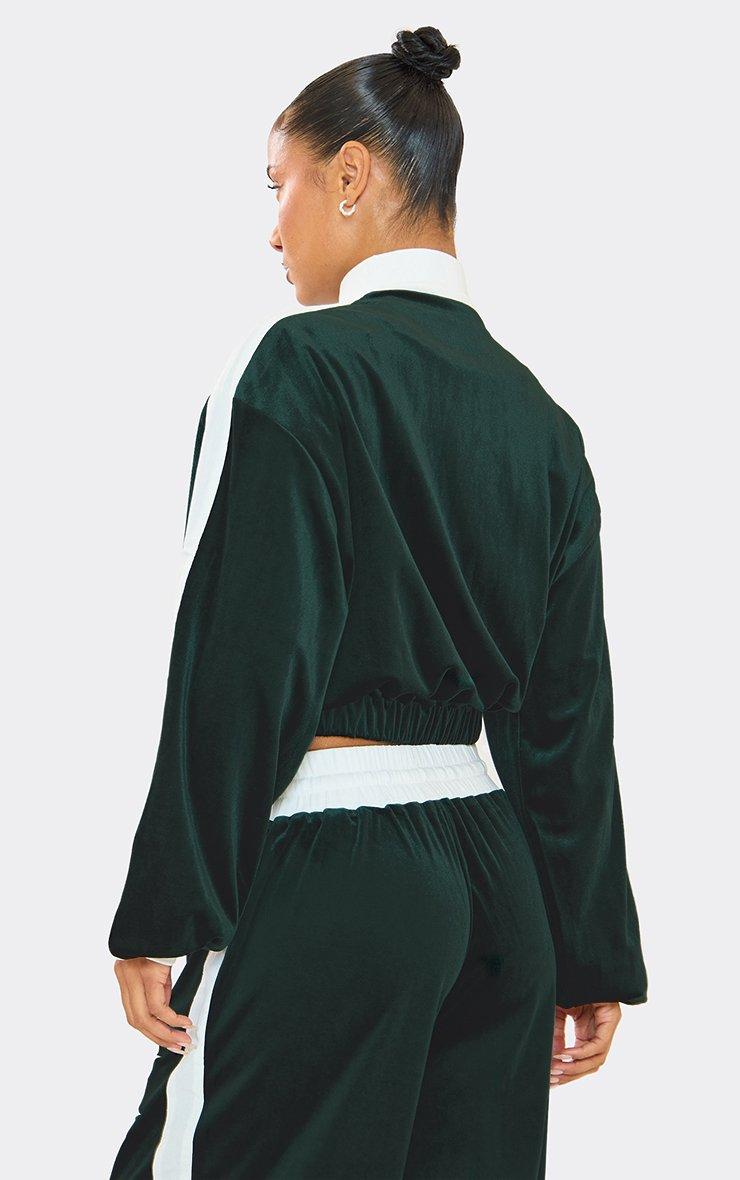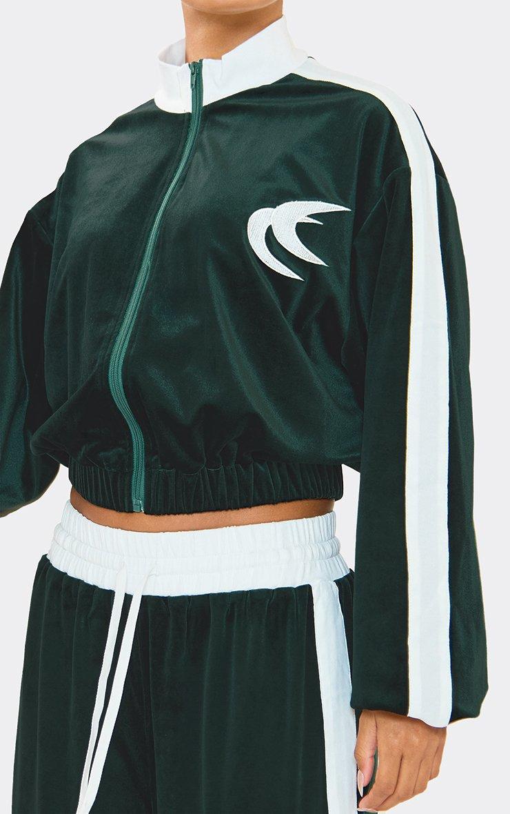 Contrast Stripe Embroidered Detail Velour Zip Up Jacket In Green Velvet