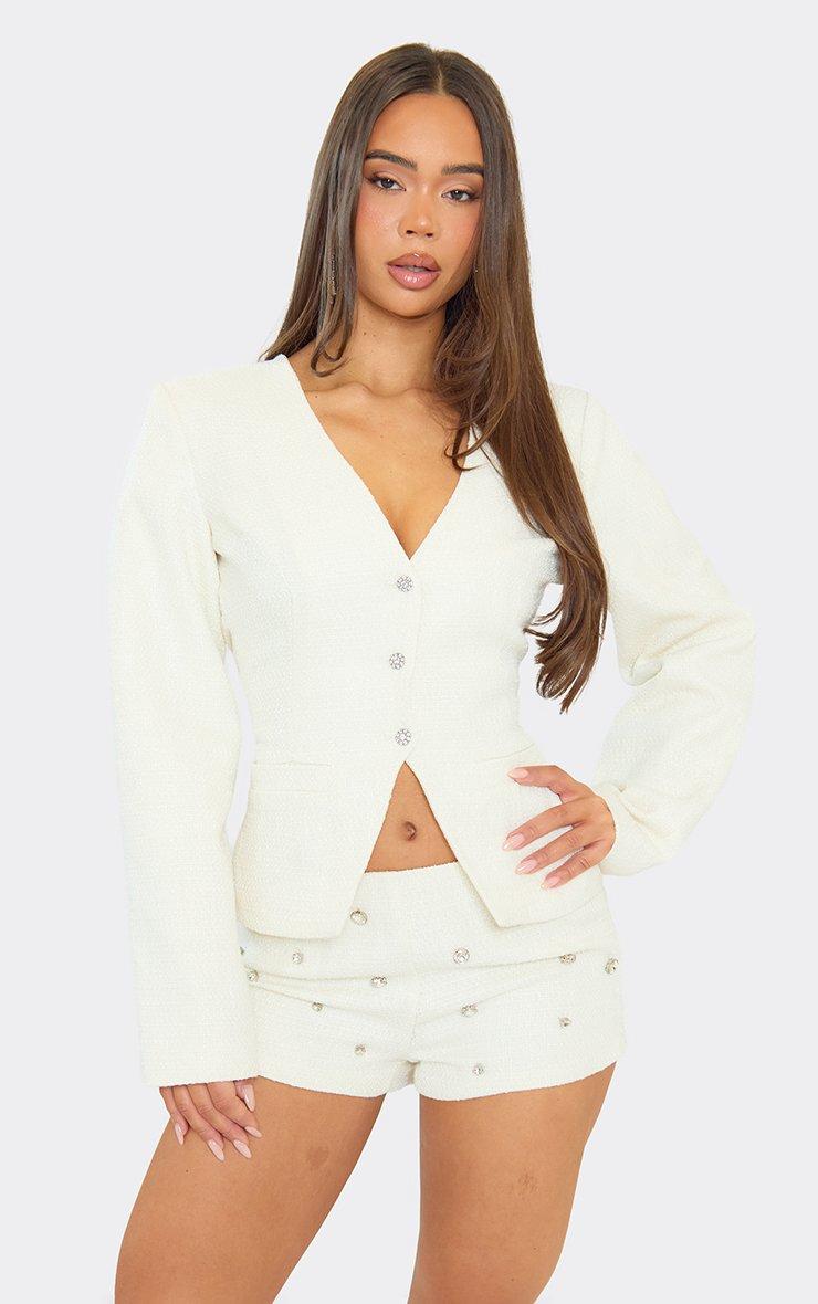Long Sleeve Plunge Neck Button Front Blazer In Cream Tweed