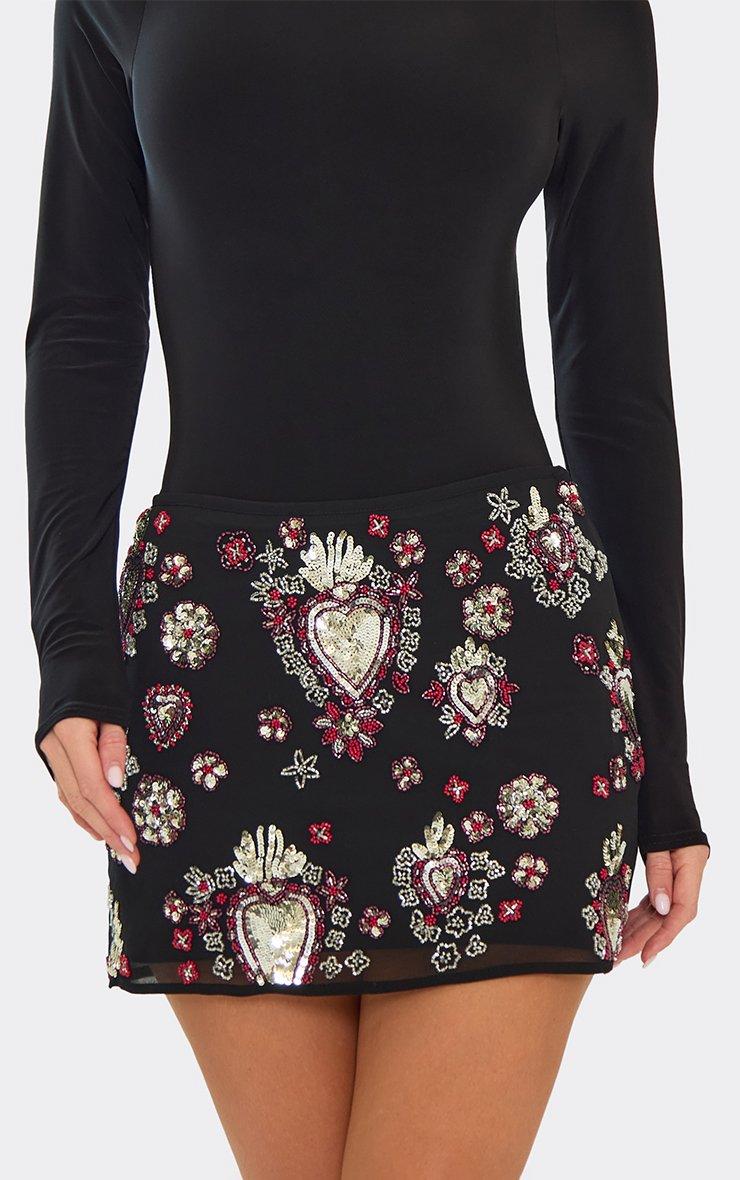 Mid Rise Tassel Detail Mini Skirt In Black Sequin