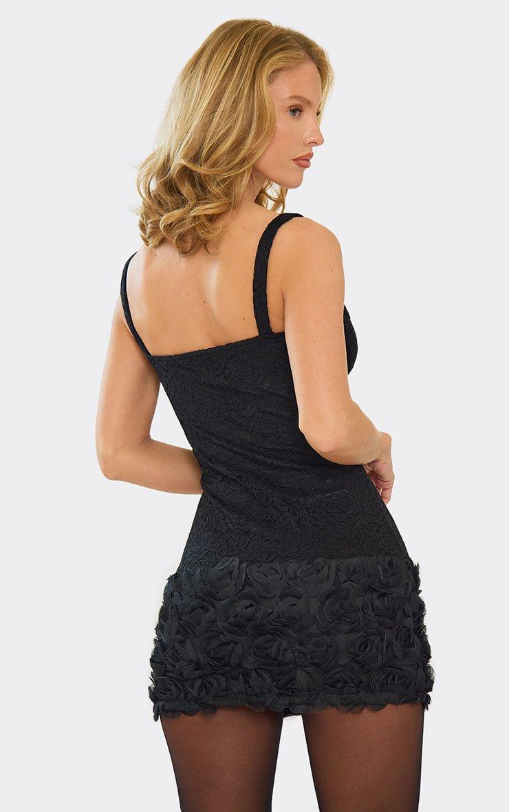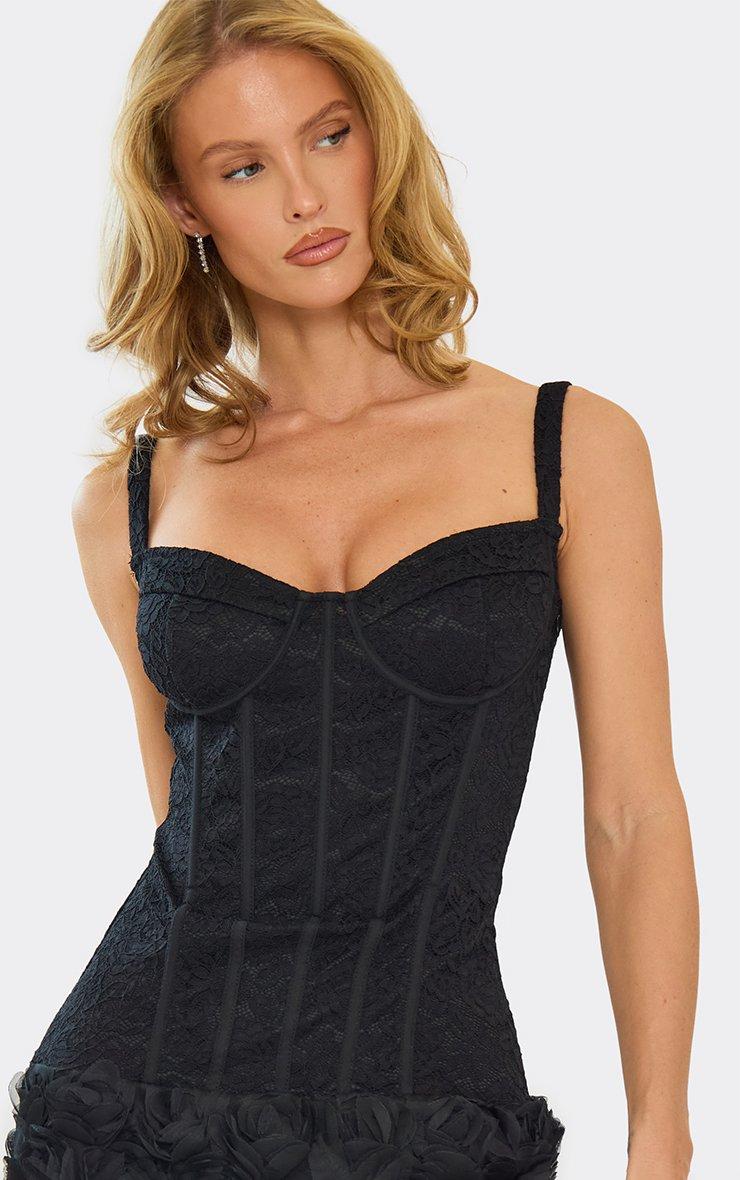Structured Cupped Detail Floral Applique Hem Mini Corset Dress In Black Lace