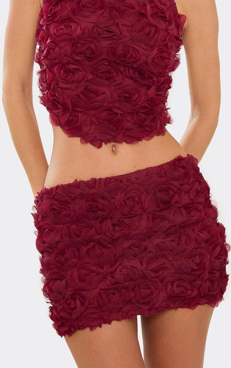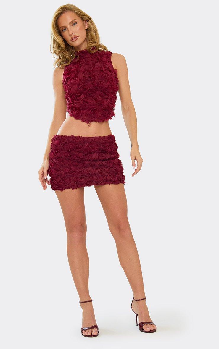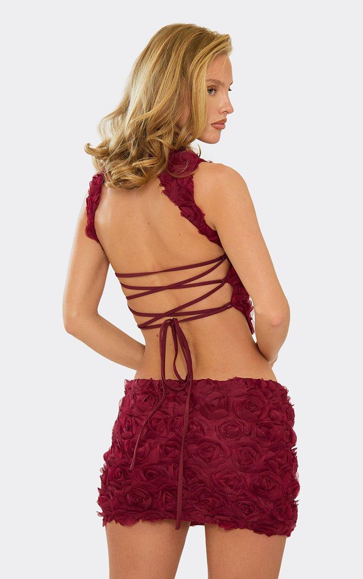 High Neck Tie Back Detail Sleeveless Top In Burgundy Floral Applique