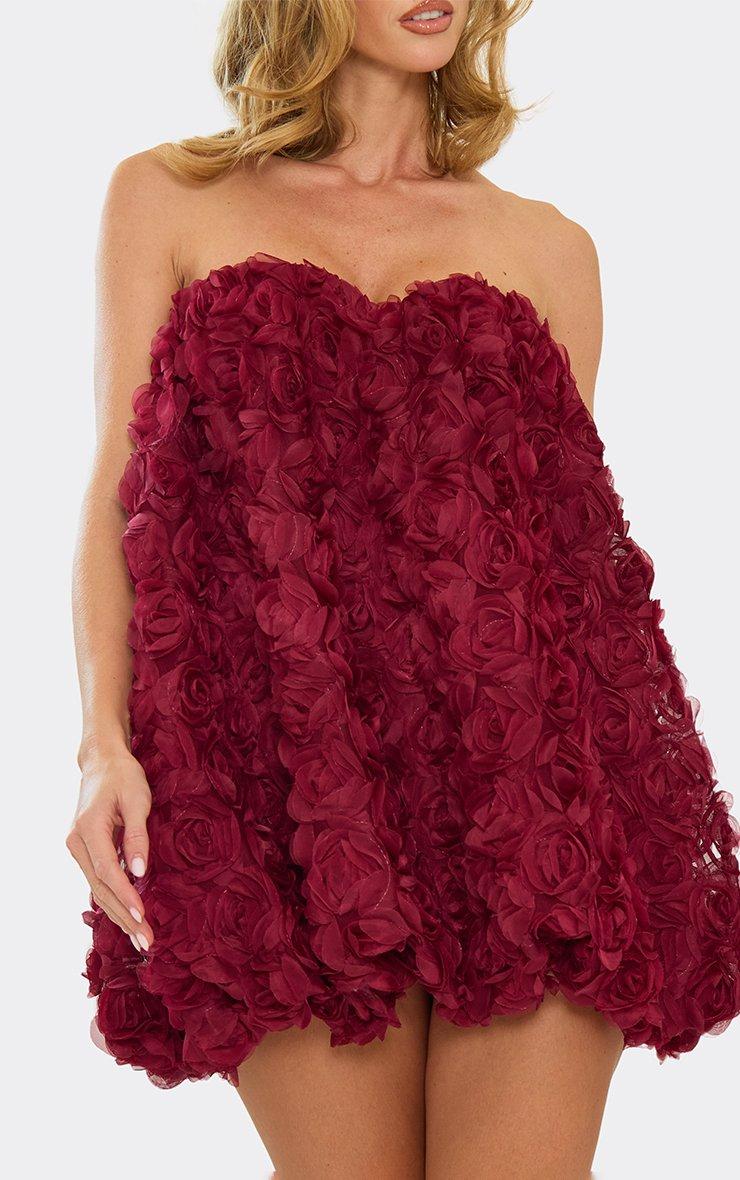 Sweetheart Neckline Puffball Mini Dress In Burgundy Floral Applique