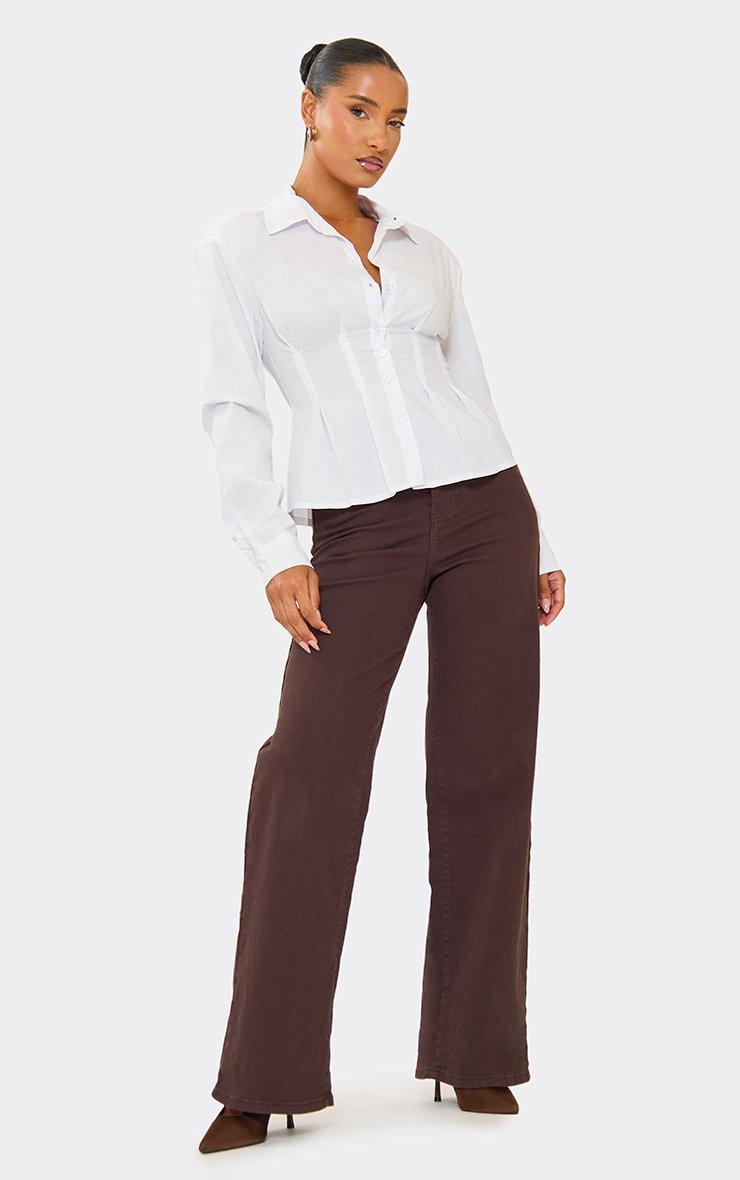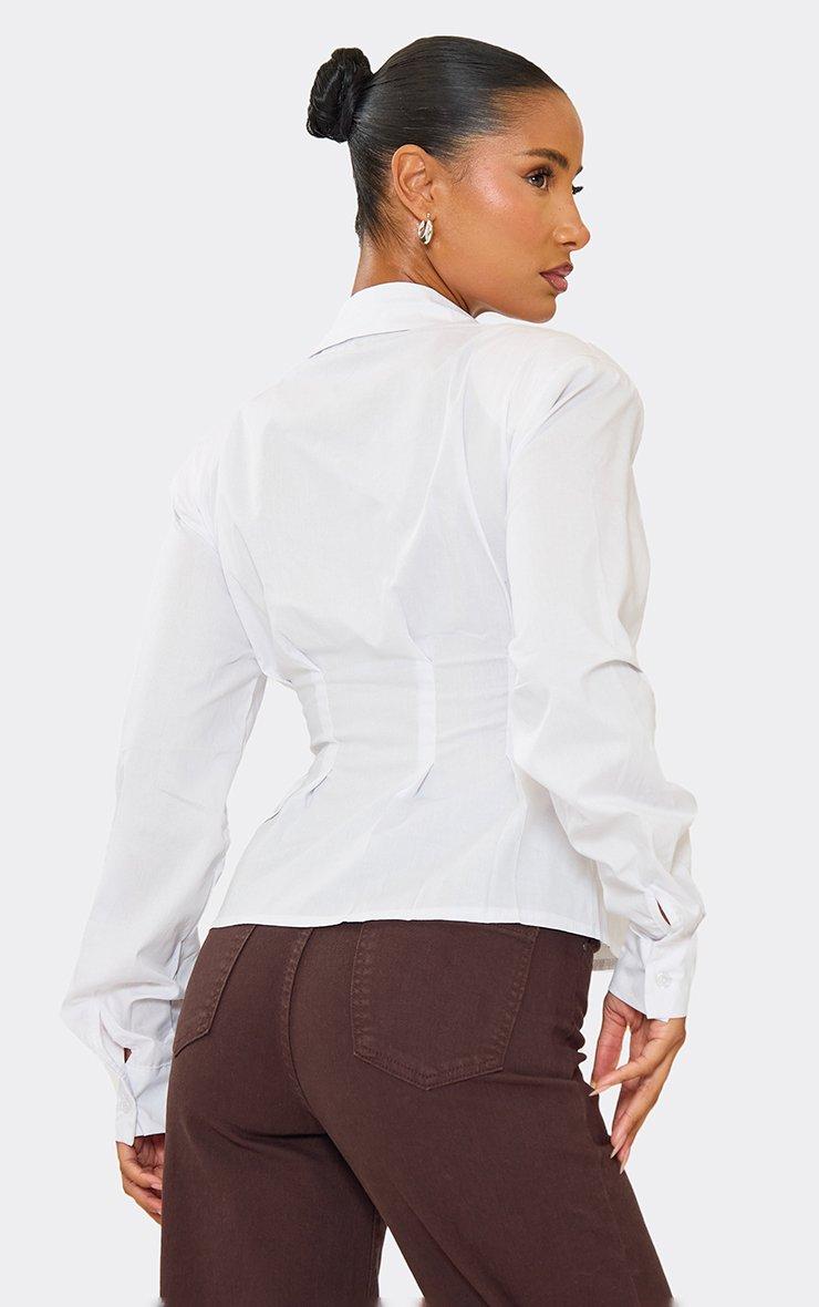 Long Sleeve Shoulder Pad Cinched Waist Detail Shirt In White