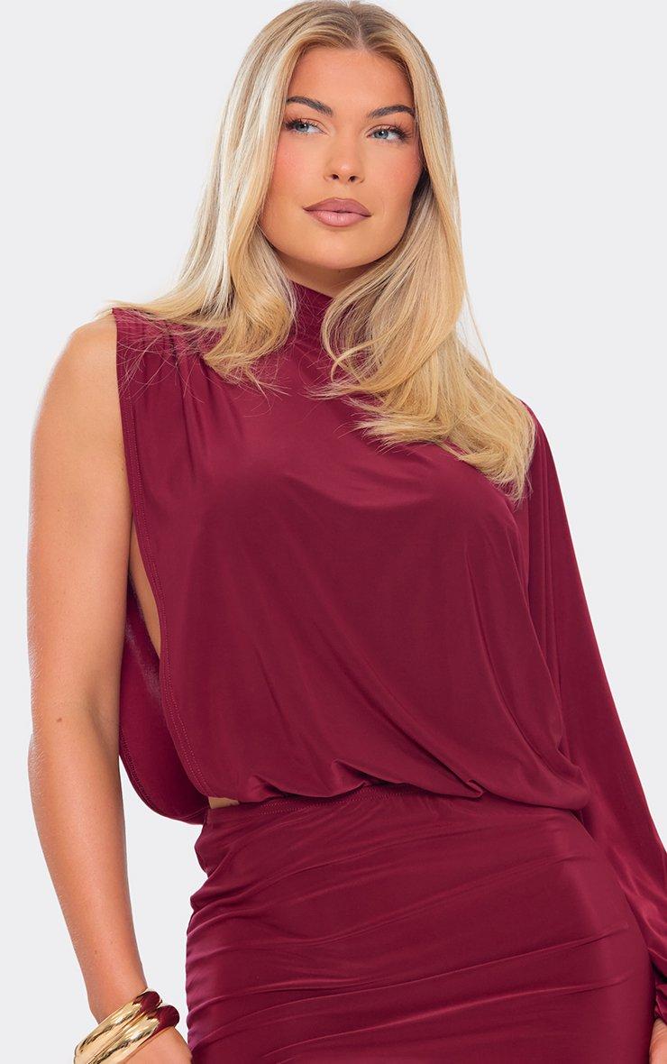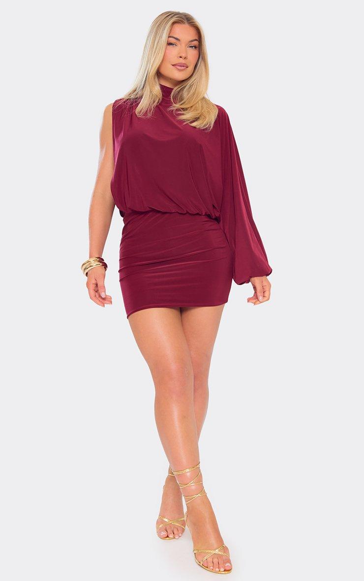 High Neck One Sleeve Drape Detail Mini Dress In Burgundy