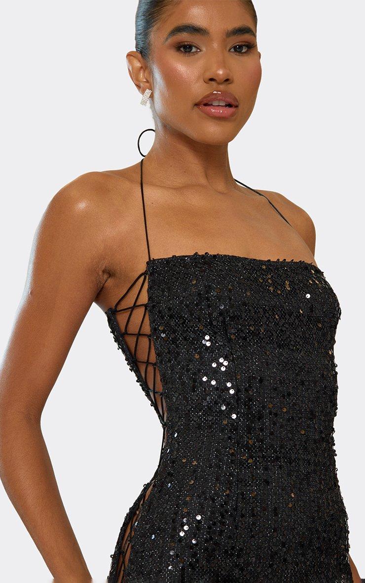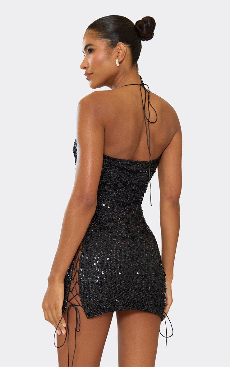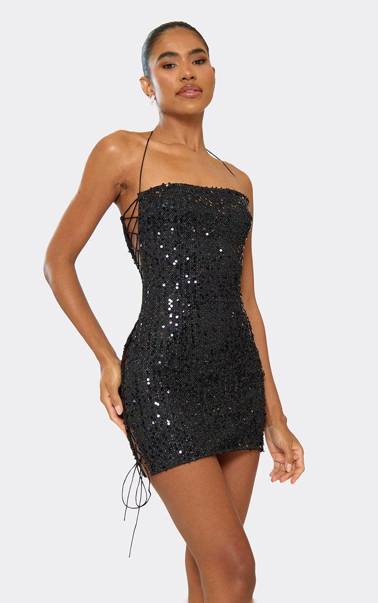 Strappy Halterneck Side Lace Up Detail Mini Dress In Black Sequin