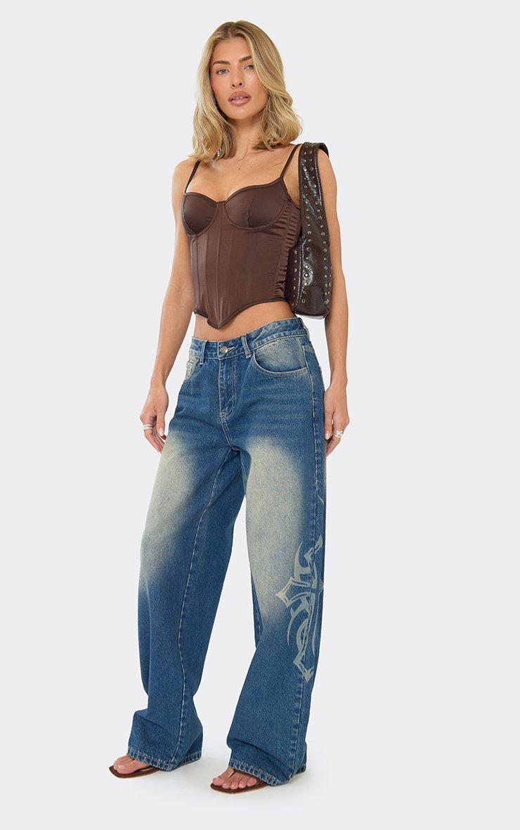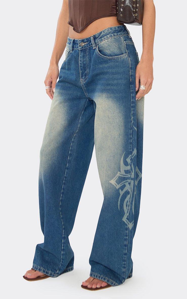 Low Rise Crucifix Wash Detail Wide Leg Jeans In Blue Denim