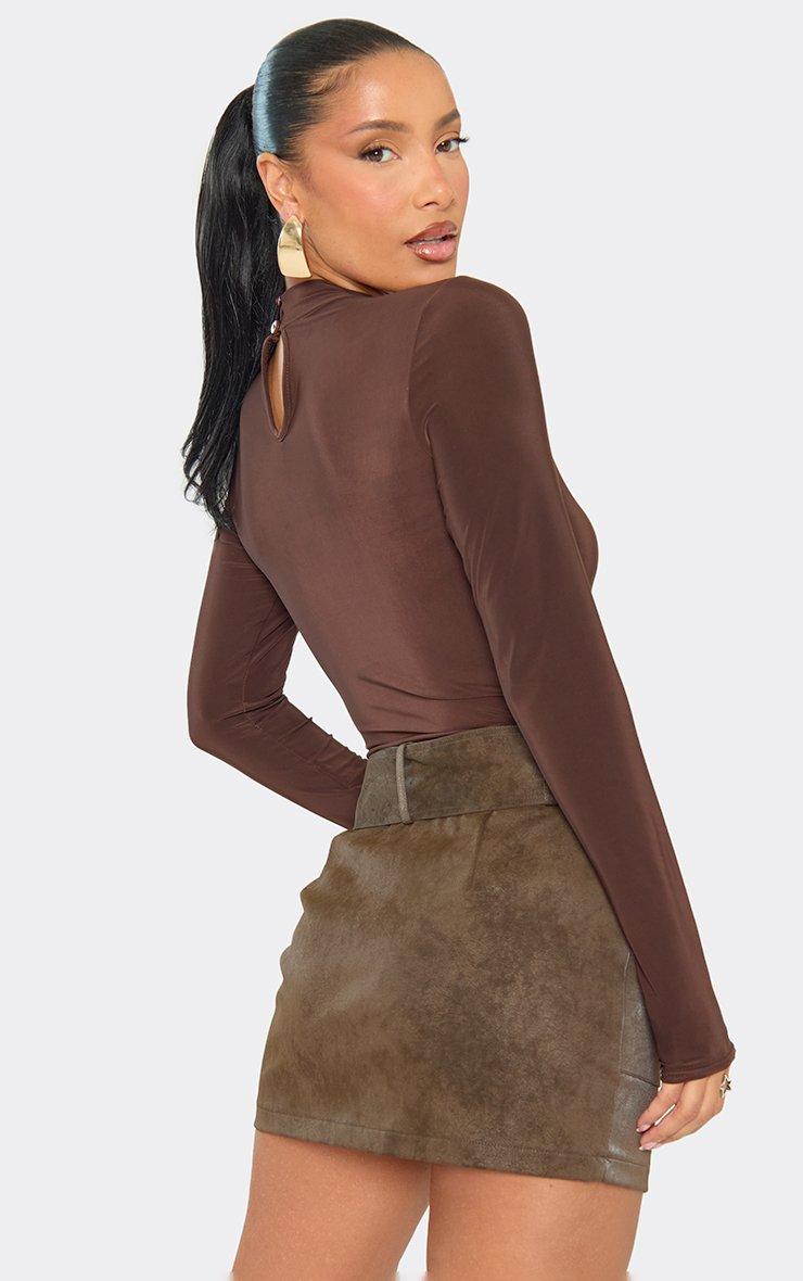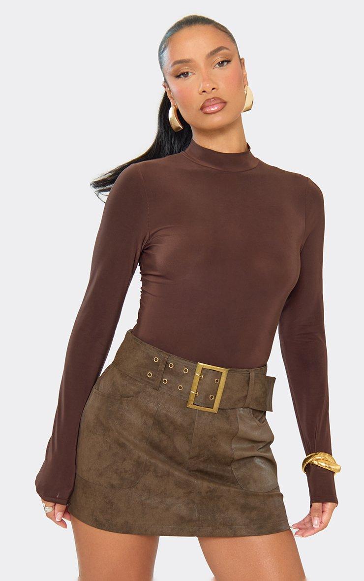 Mid Rise Ruched Front Detail Mini Skirt In Chocolate Brown Satin