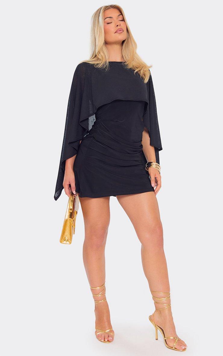 cape overlay ruched detail mini dress in black