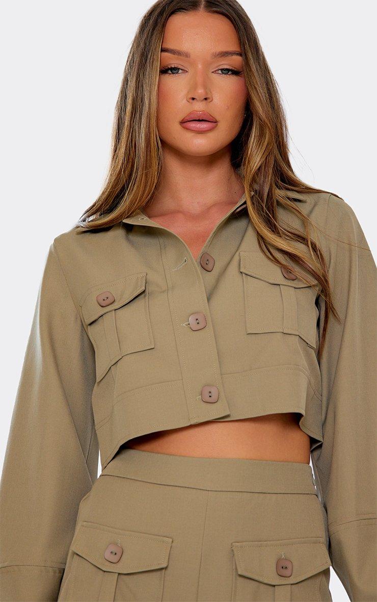 Oversized Belt Detail Cargo Style Cropped Jacket In Brown