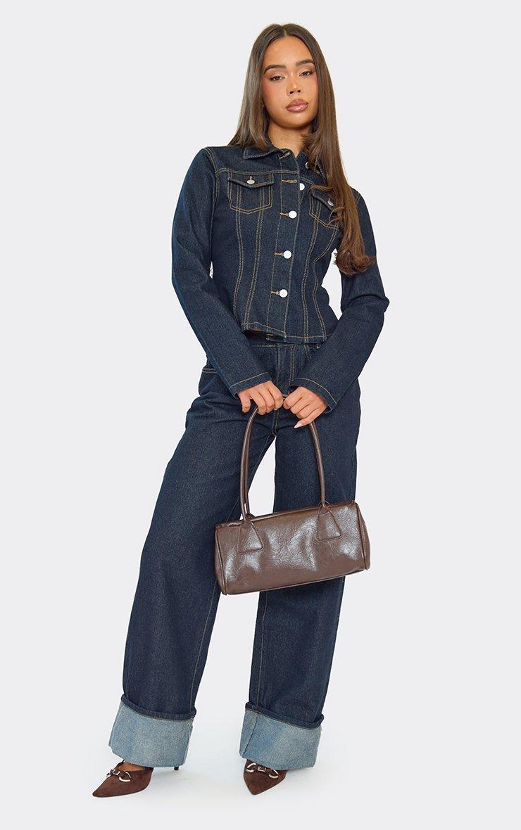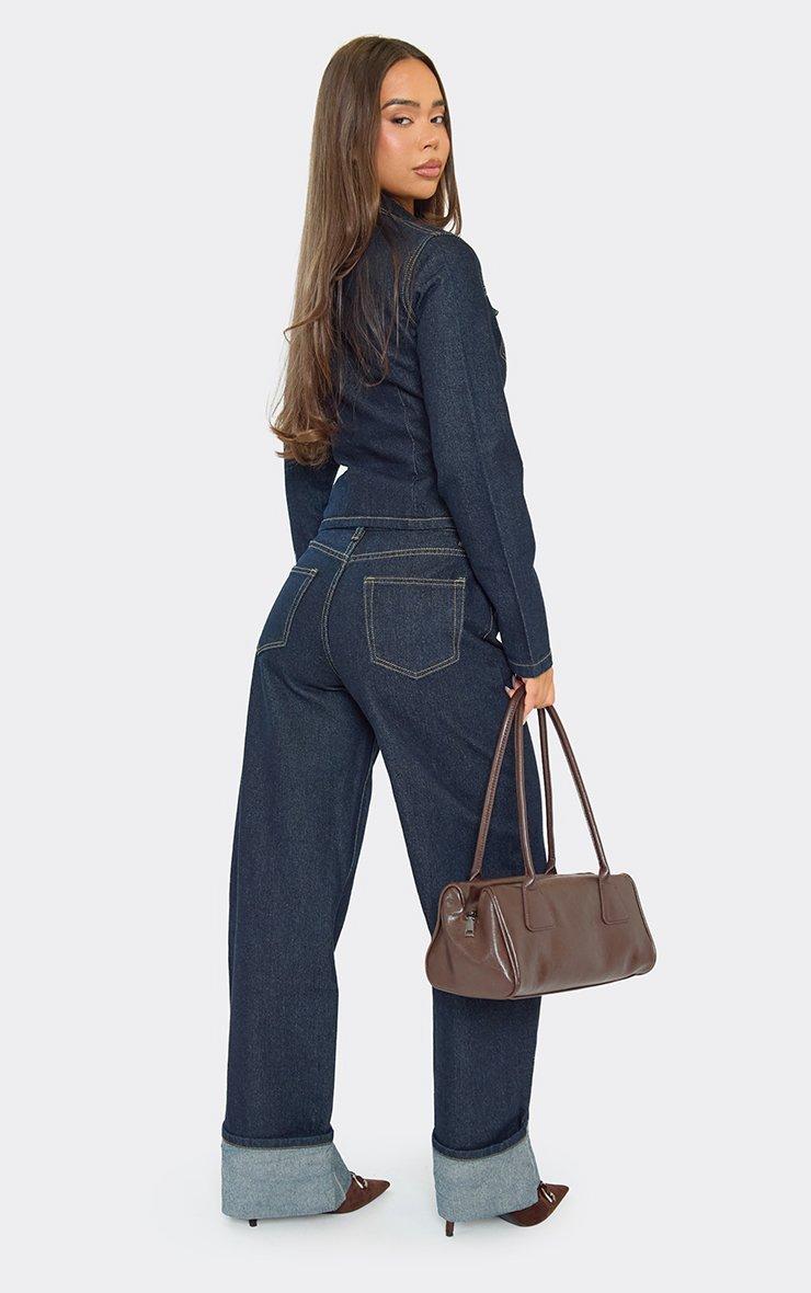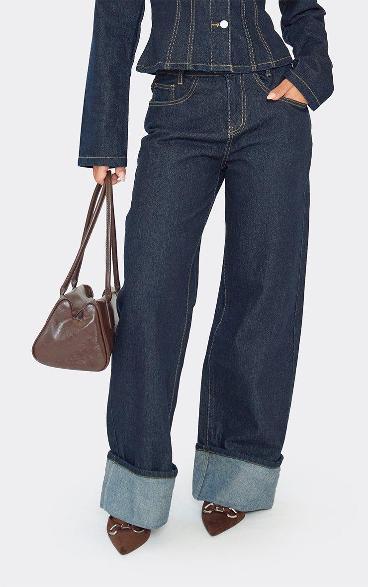Mid Rise Turn Up Hem Wide Leg Jeans In Dark Indigo Denim