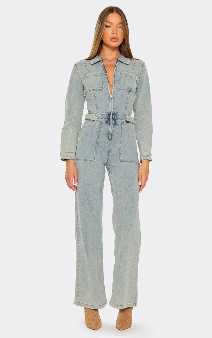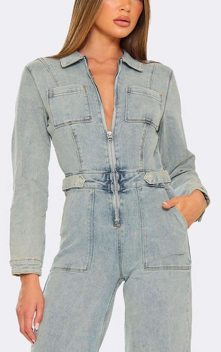 Long Sleeve Collared Zip Down Jumpsuit In Washed Blue Denim