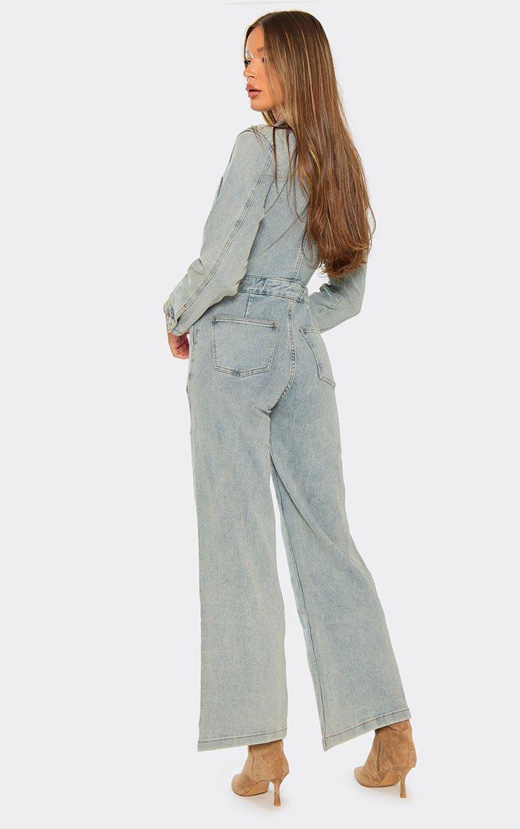 Long Sleeve Button Down Collared Detail Jumpsuit In Washed Blue Denim