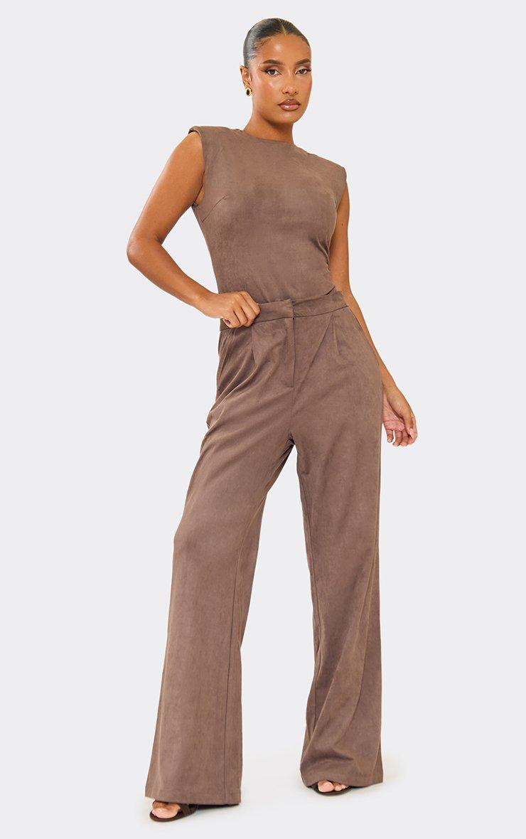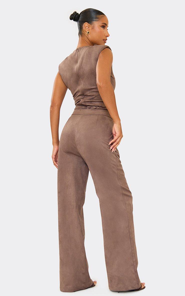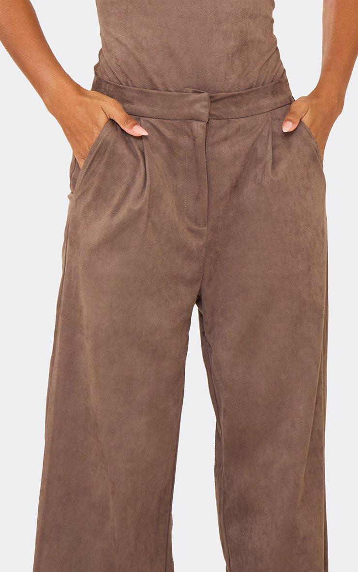 Mid Rise Wide Leg Tailored Trousers In Taupe Faux Suede